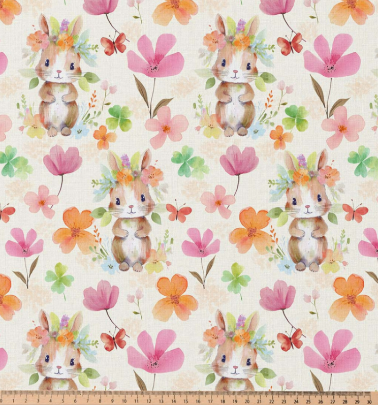 Baumwollstoff Popeline Digitaldruck Kaninchen mit Blumen ecru rosa orange grün 1,47m Breite