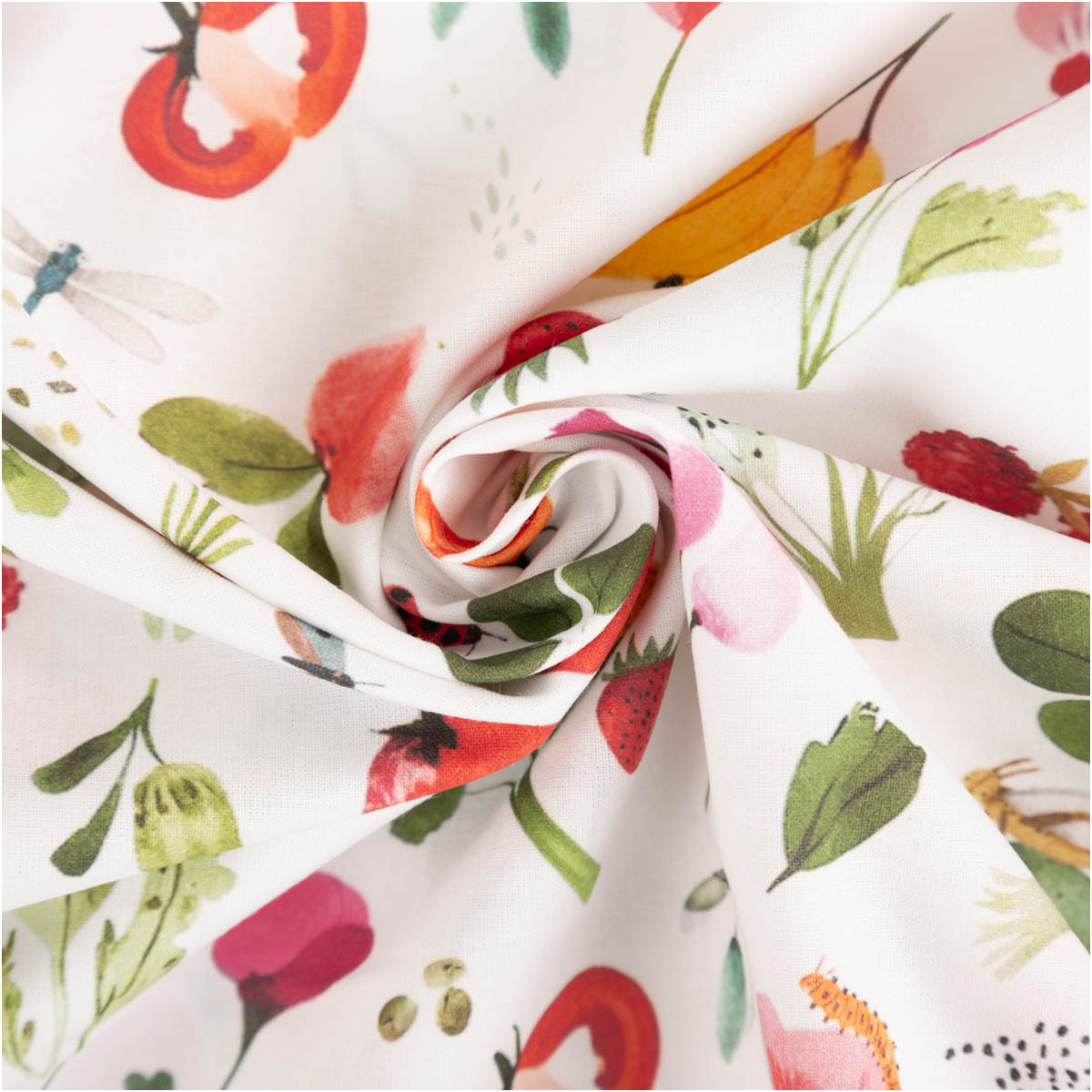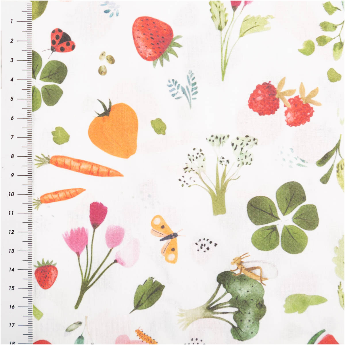 Dieser hochwertige Baumwollstoff Popeline aus 100 % Baumwolle überzeugt mit dem exklusiven französischen Digitaldruck „Vitam“. Das fröhliche Dessin zeigt eine liebevoll illustrierte Vielfalt aus Früchten, Gemüse, Blüten und kleinen Naturmotiven auf weißem Grund. Die bunten, harmonisch abgestimmten Farben wirken lebendig, modern und zugleich angenehm ruhig – perfekt für kreative Projekte rund um Kinder, Alltag und Wohnen.