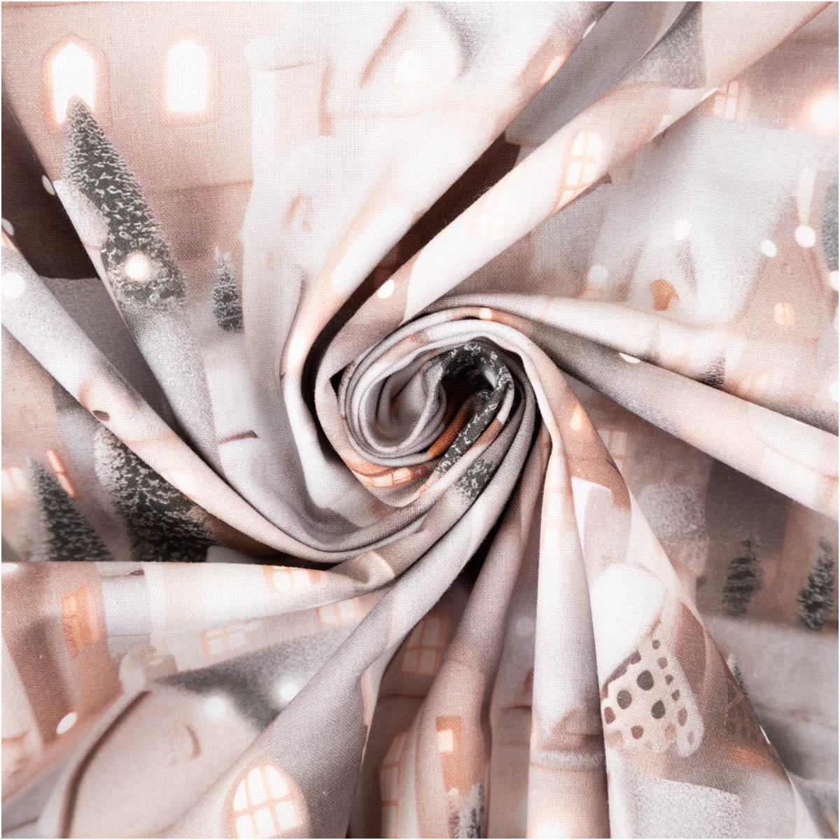 Baumwollstoff Popeline Digitaldruck Weihnachtsstoff Lichterhäuser grau beige 1,47m Breite