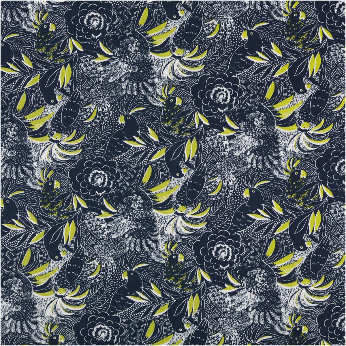 Baumwollstoff Popeline Junko Blätter Vögel dunkelblau neongrün 1,45m Breite