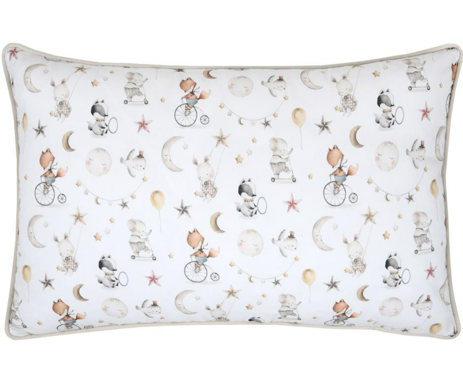 Liebevoll gestalteter Baumwollstoff mit niedlichen Tierkindern, Mond, Sternen, Ballons und verträumten Motiven auf weißem Hintergrund