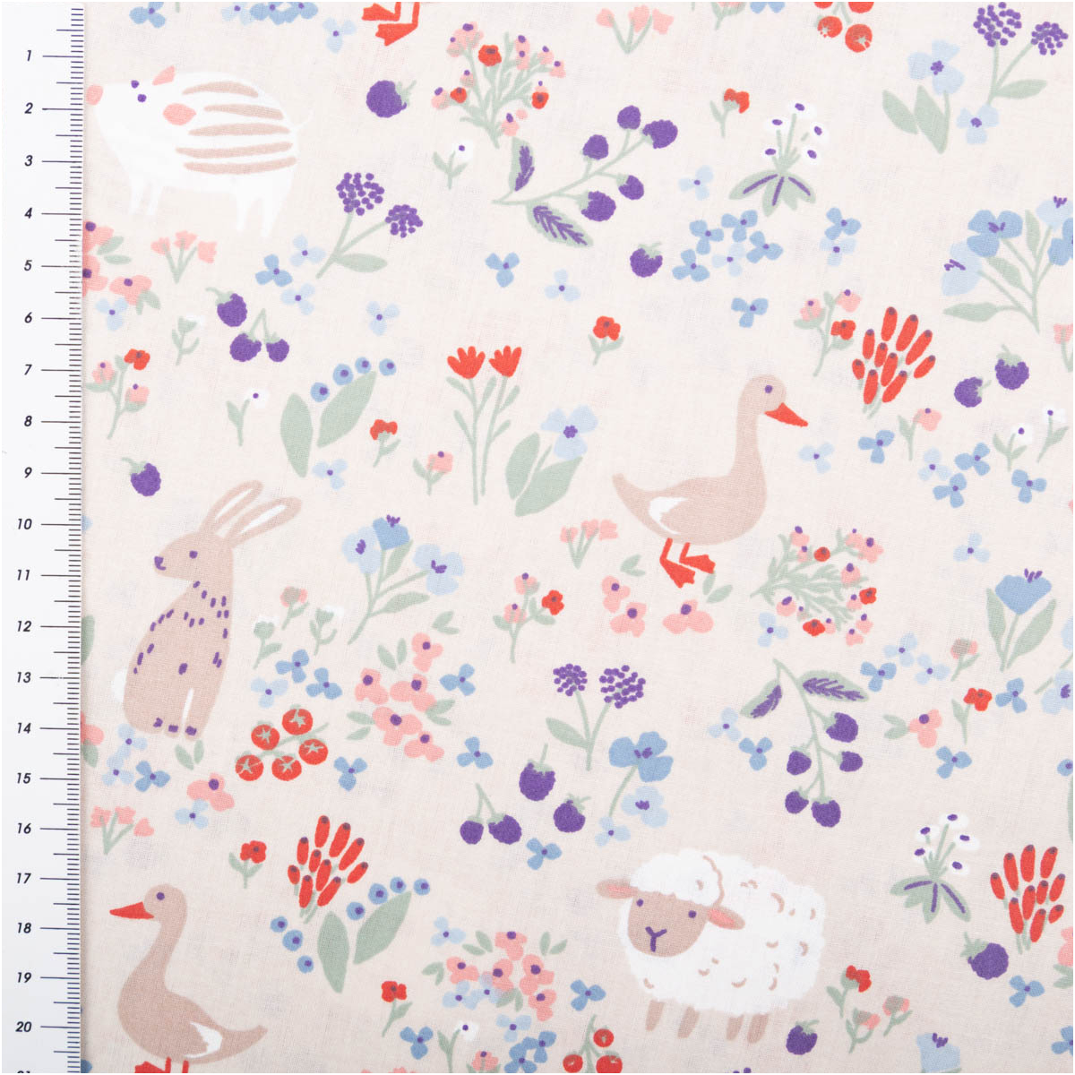 Der Baumwollstoff Berries Tiere Blumen grau bringt mit seinem liebevollen Design gute Laune in jedes Nähprojekt. Auf grauem Grund tummeln sich fröhliche Tiere wie Schafe, Hasen, Enten und Igel zwischen bunten Blumen und Beeren. Das macht diesen Stoff besonders charmant für Kinder- und Babyprojekte, aber auch für kreative Accessoires und frische Dekoideen.