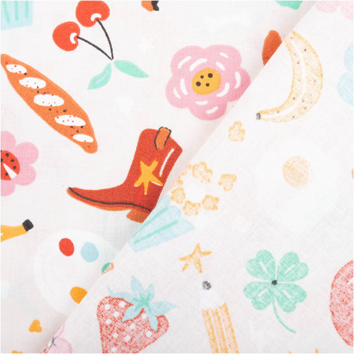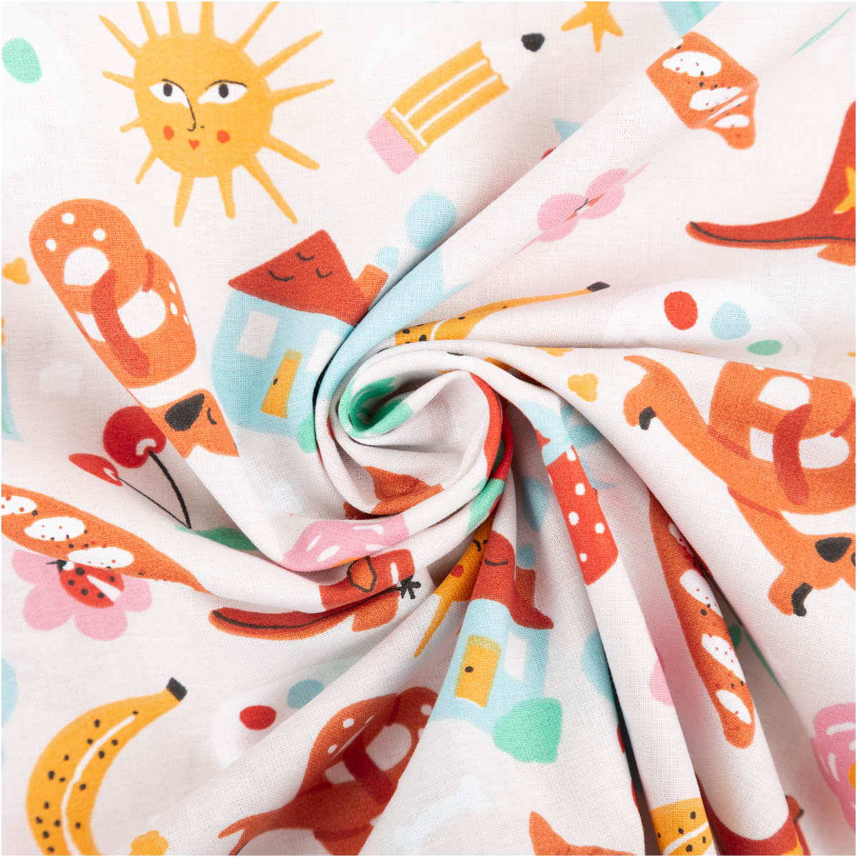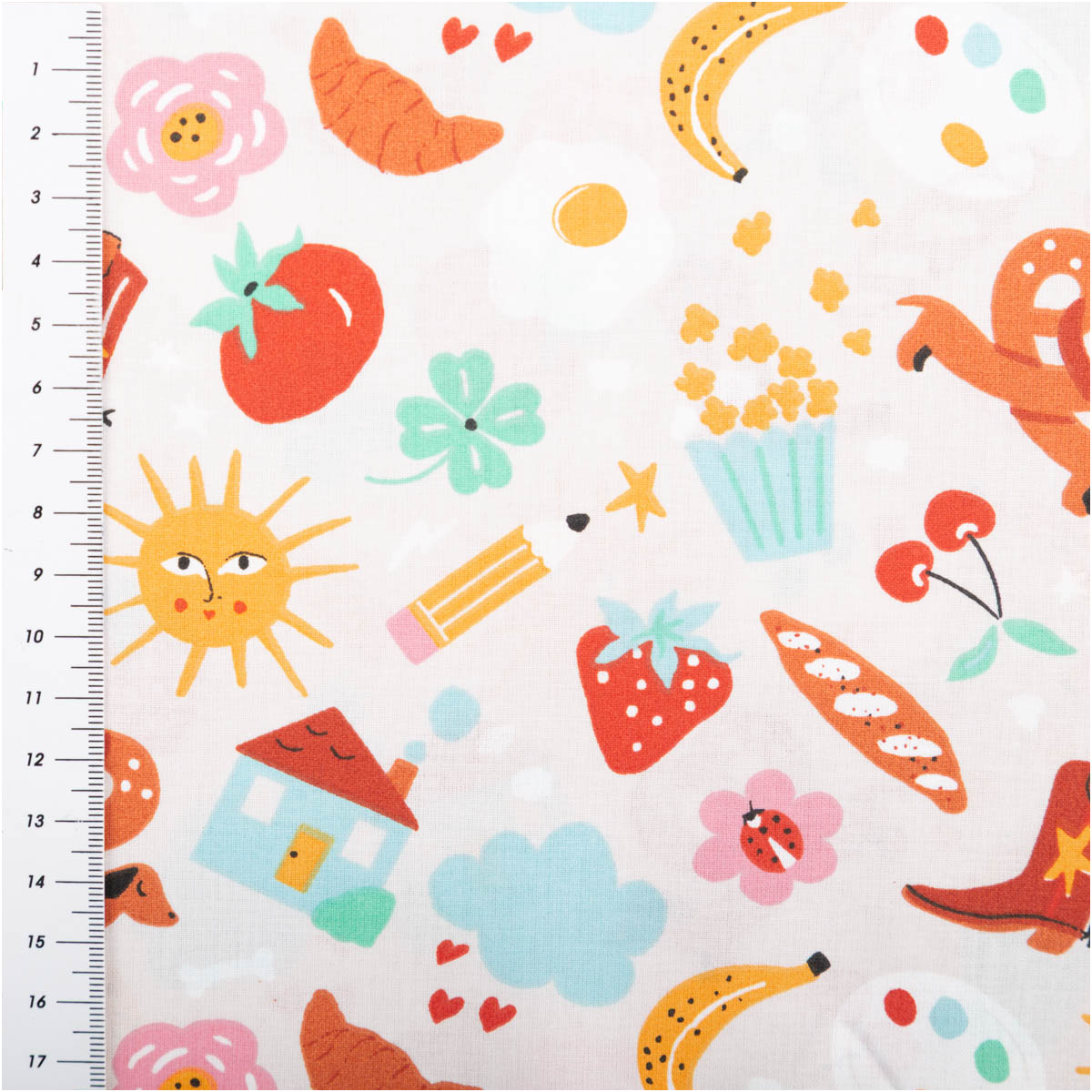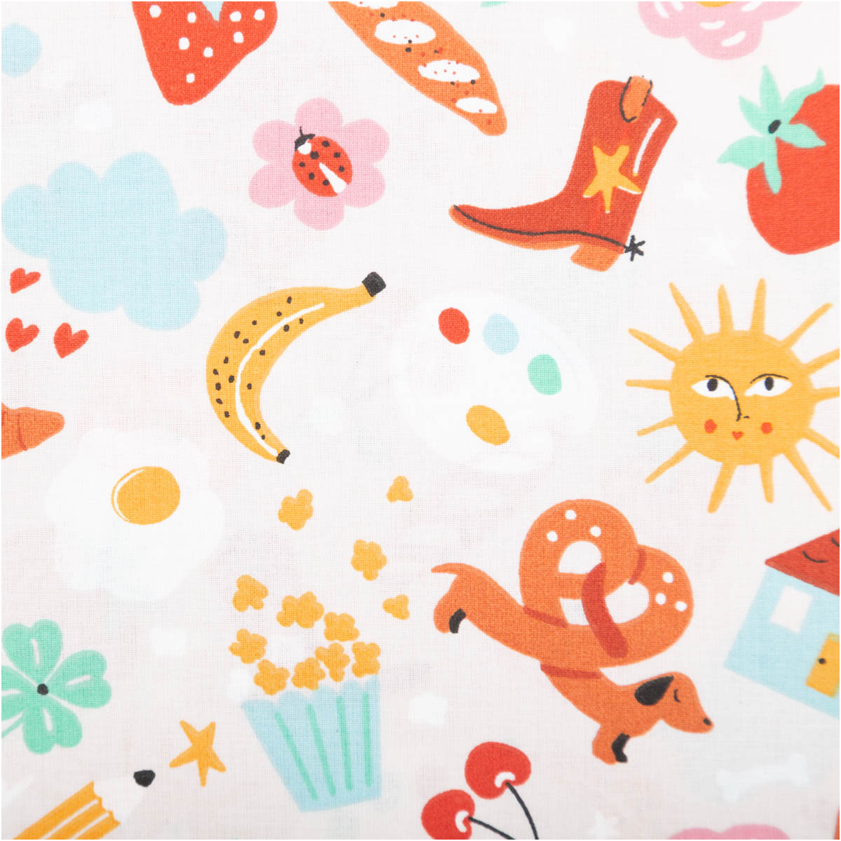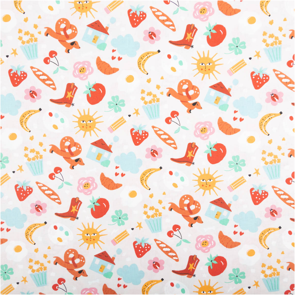 Der Baumwollstoff Bretz Stiefel Dackel Sonne bunt ist ein echter Gute-Laune-Stoff für kreative Projekte. Auf hellem Grund tummeln sich fröhliche Motive wie Dackel, Sonnen, Stiefel, Früchte, Häuser, Blumen und viele bunte Details. Dieses außergewöhnliche Design macht den Stoff zum Highlight für Kinderprojekte, farbenfrohe Accessoires oder originelle Dekoideen.