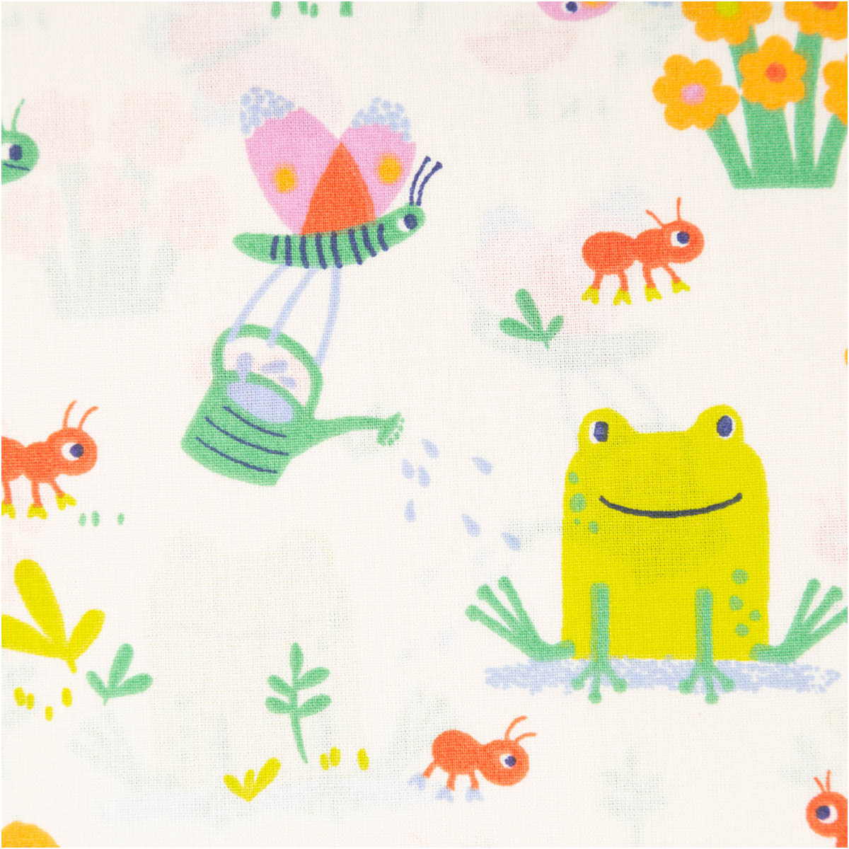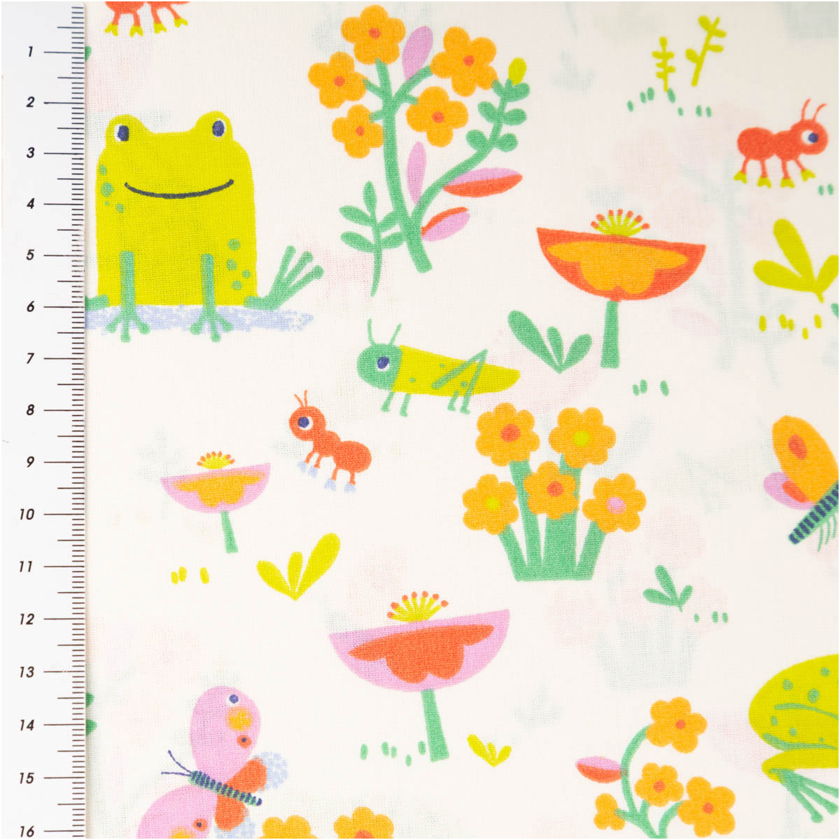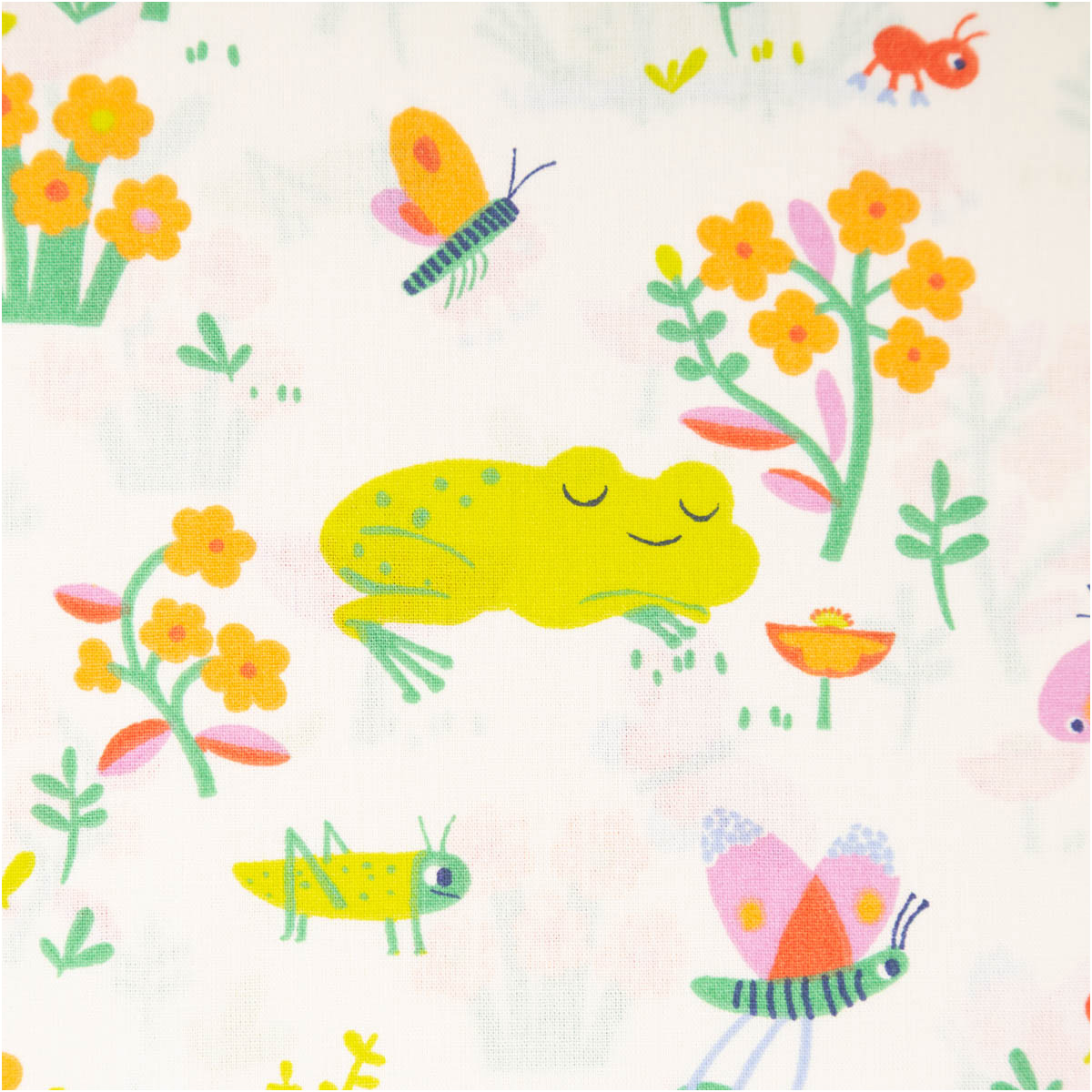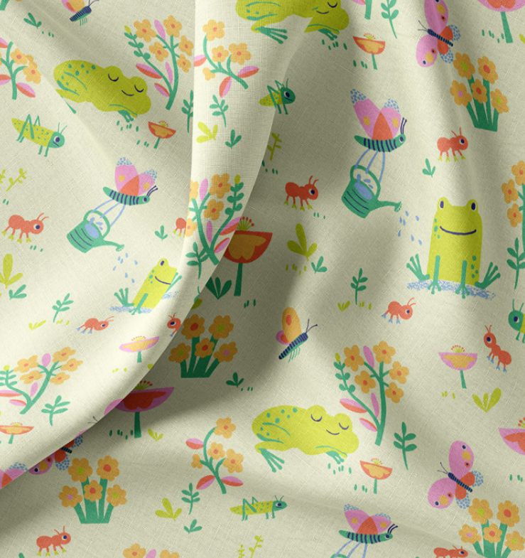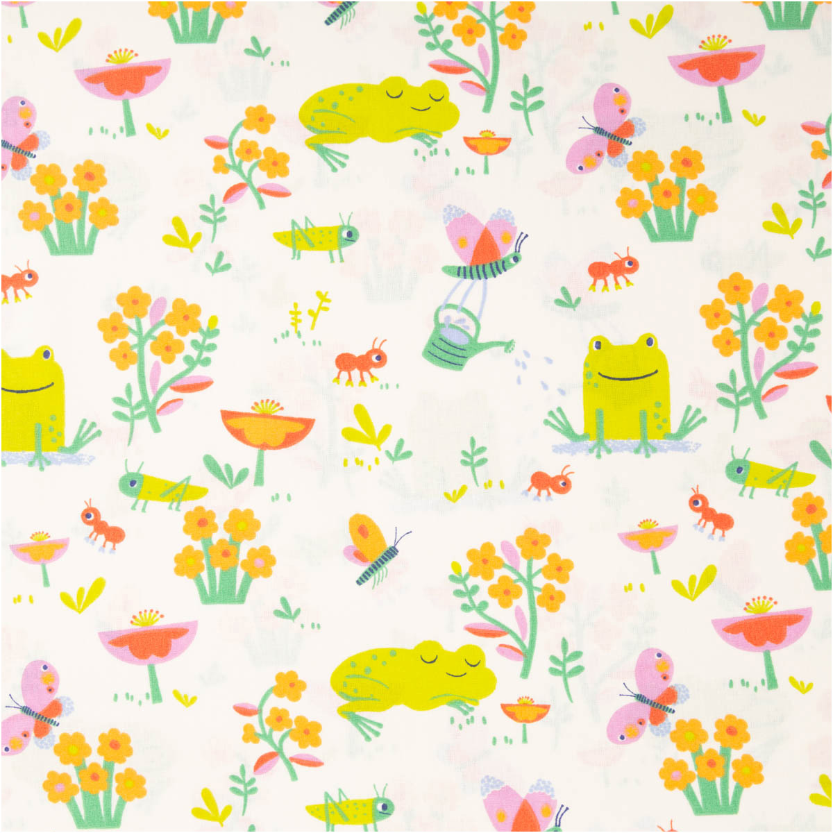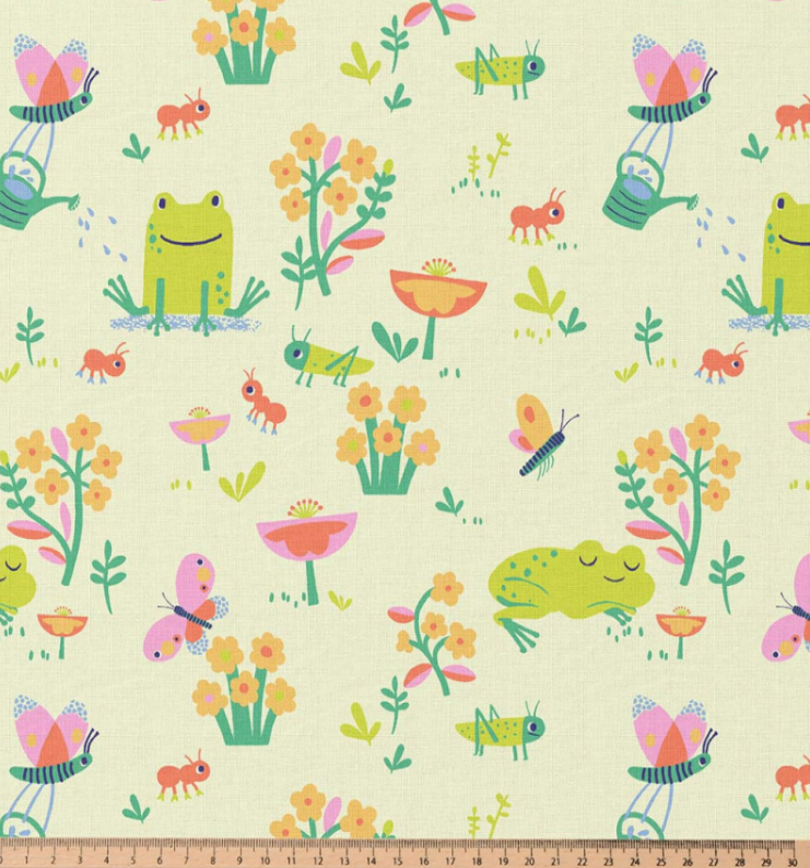 Dieser fröhliche Baumwollstoff begeistert mit einem liebevoll illustrierten Dessin aus Fröschen, Schmetterlingen, Blumen und kleinen Insekten. Die bunten Motive in Grün, Gelb, Rosa und Orange verteilen sich harmonisch auf hellem Grund und sorgen für eine freundliche, kindgerechte Optik.