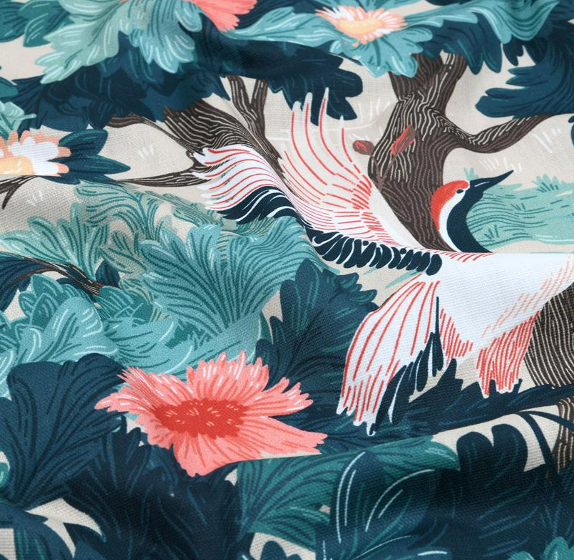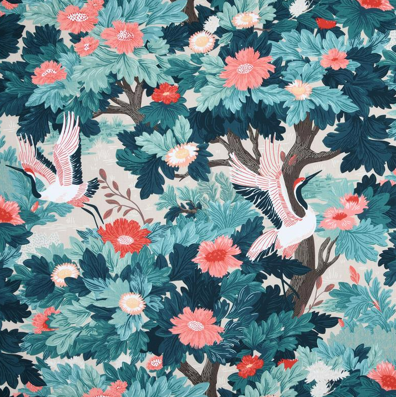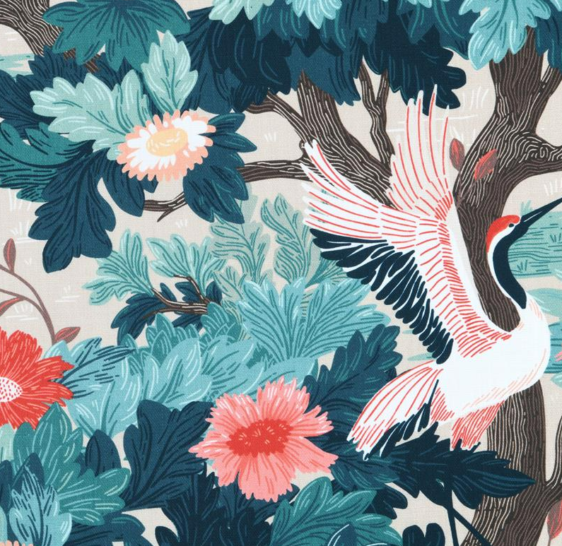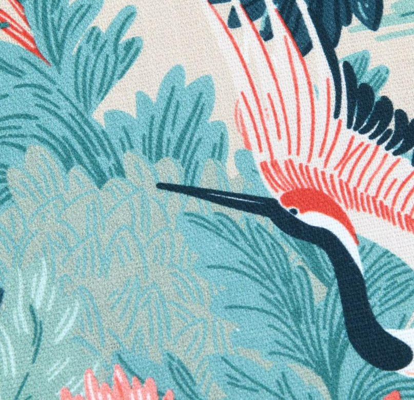 Dieser hochwertige Baumwollstoff in Panama-Bindung begeistert mit einem ausdrucksstarken Motiv aus eleganten Kranichen, üppigen Blumen und Blättern in Türkisblau, Rot und Naturtönen. Das exklusive französische Dessin verleiht dem Stoff eine besondere Tiefe und macht ihn zu einem echten Blickfang für stilvolle Wohn- und Dekoideen.