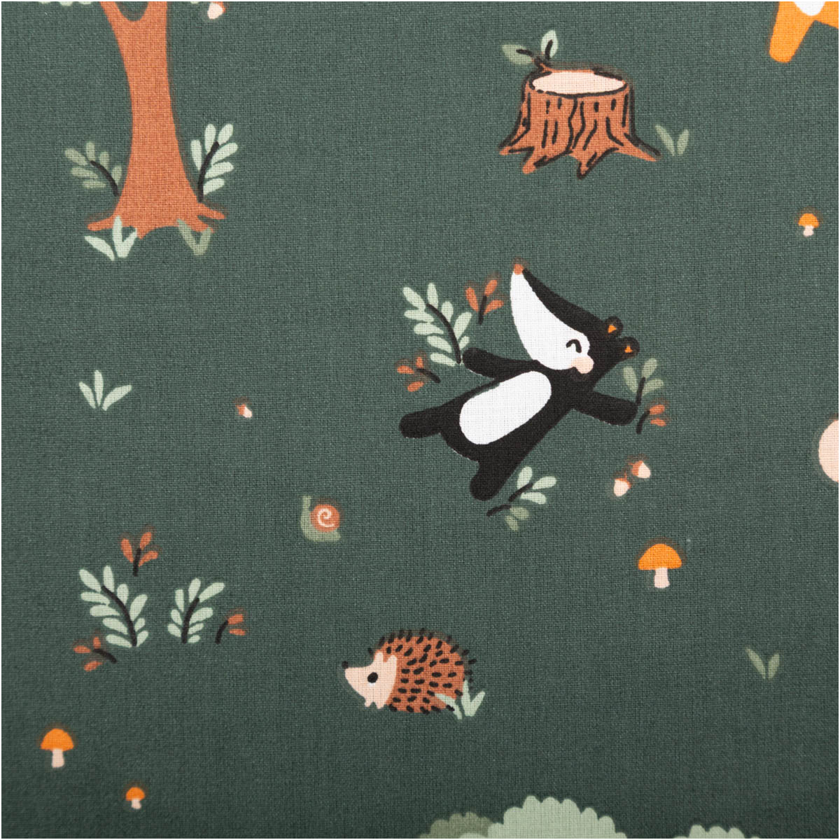 Der Baumwollstoff Guy Waldtiere Bäume grün bringt mit seinen fröhlichen Waldmotiven echte Naturstimmung in dein Nähprojekt. Füchse, Dachse, Igel und Eichhörnchen tummeln sich zwischen Bäumen, Sträuchern und Pilzen – ein Design, das Kinder begeistert und jedes Projekt lebendig macht.
