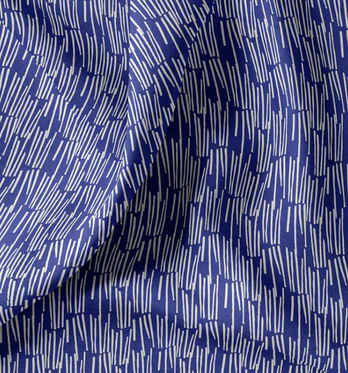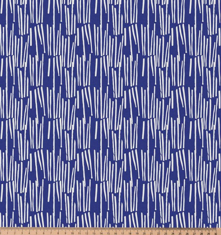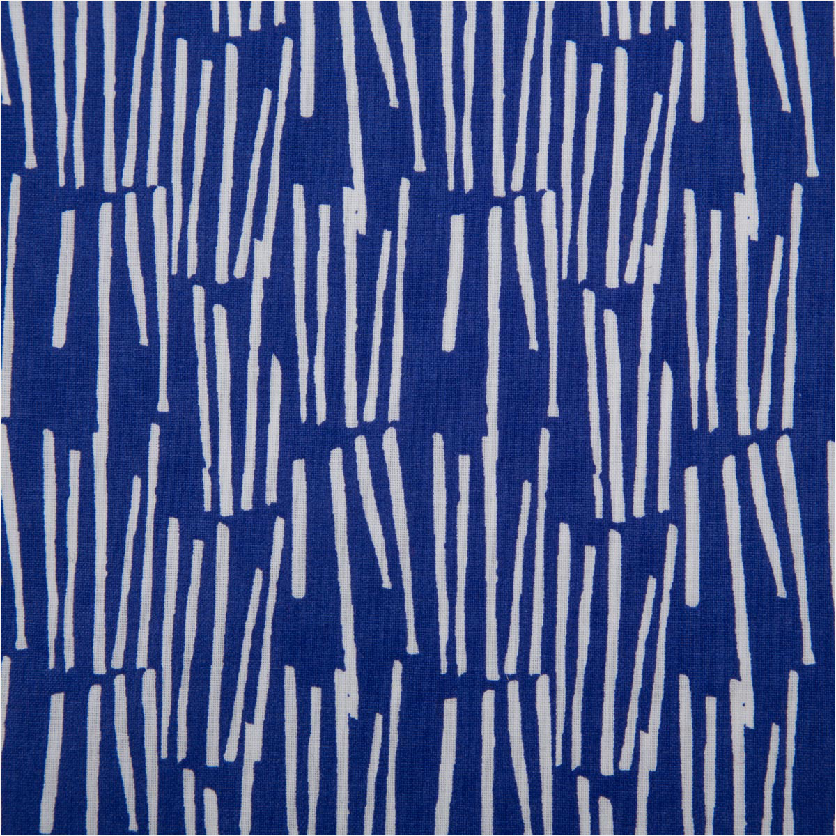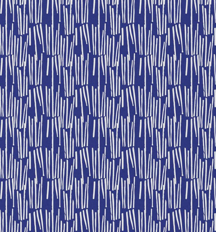 Der Baumwollstoff Lekker beeindruckt mit einem modernen, grafischen Dessin: unregelmäßige weiße Striche auf kräftigem Blau erzeugen ein dynamisches Muster, das besonders gut für Mode, Accessoires und kreative Wohnideen geeignet ist.