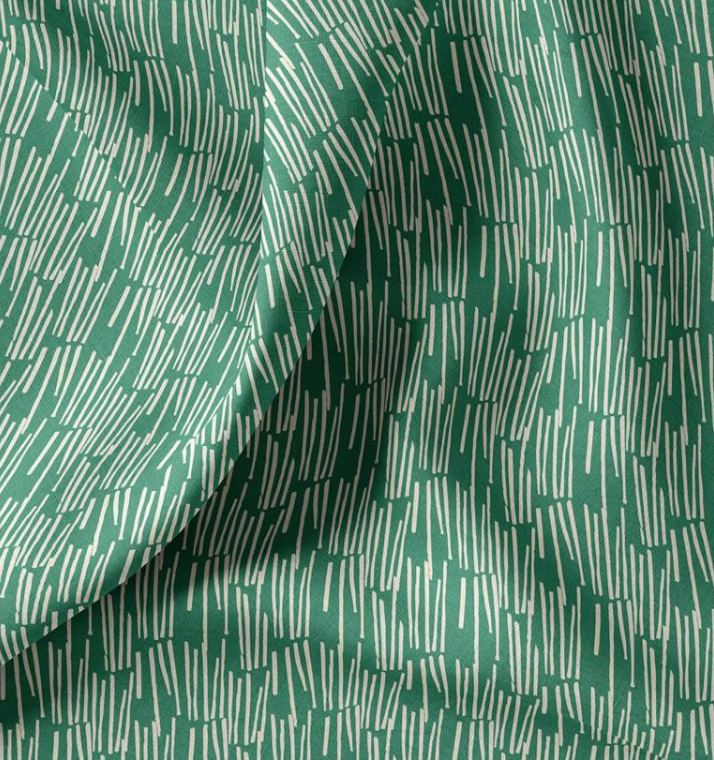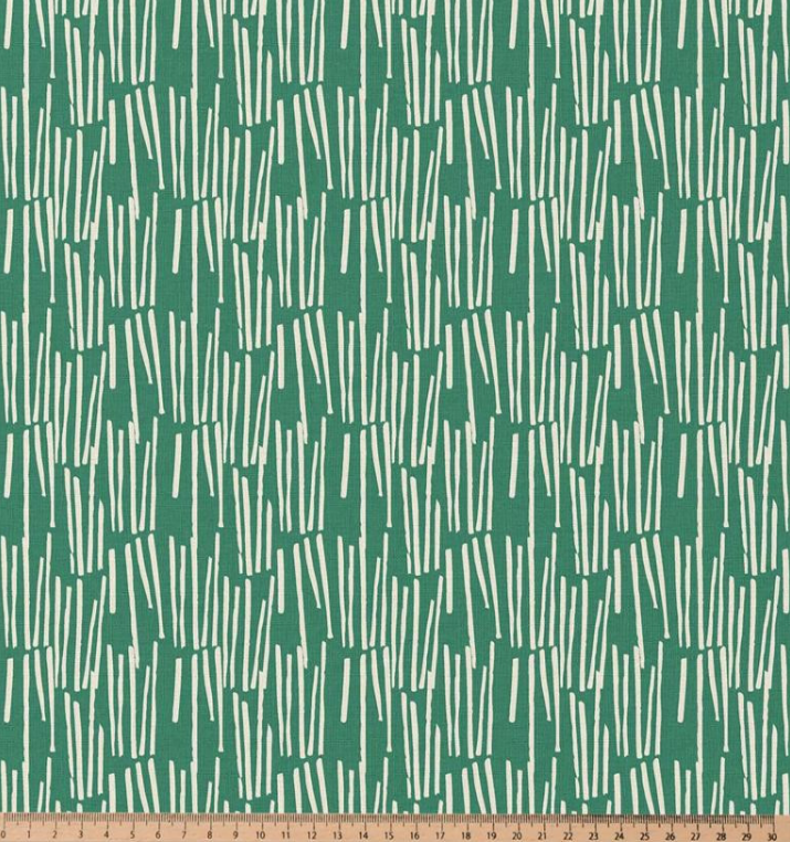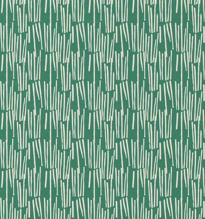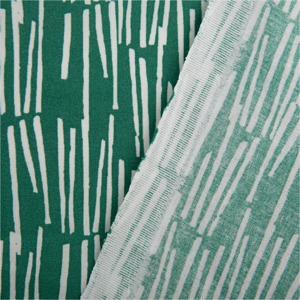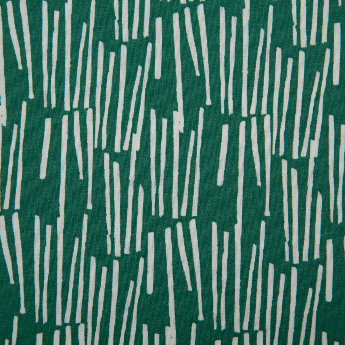 Der Baumwollstoff Lekker beeindruckt mit einem modernen, grafischen Dessin: unregelmäßige weiße Striche auf kräftigem Grün erzeugen ein dynamisches Muster, das besonders gut für Mode, Accessoires und kreative Wohnideen geeignet ist.