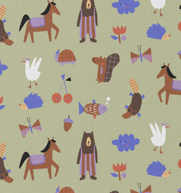 Die niedlichen Motive wie Bär, Pferd, Igel, Vogel und viele kleine Details machen diesen Stoff zu einem echten Hingucker.