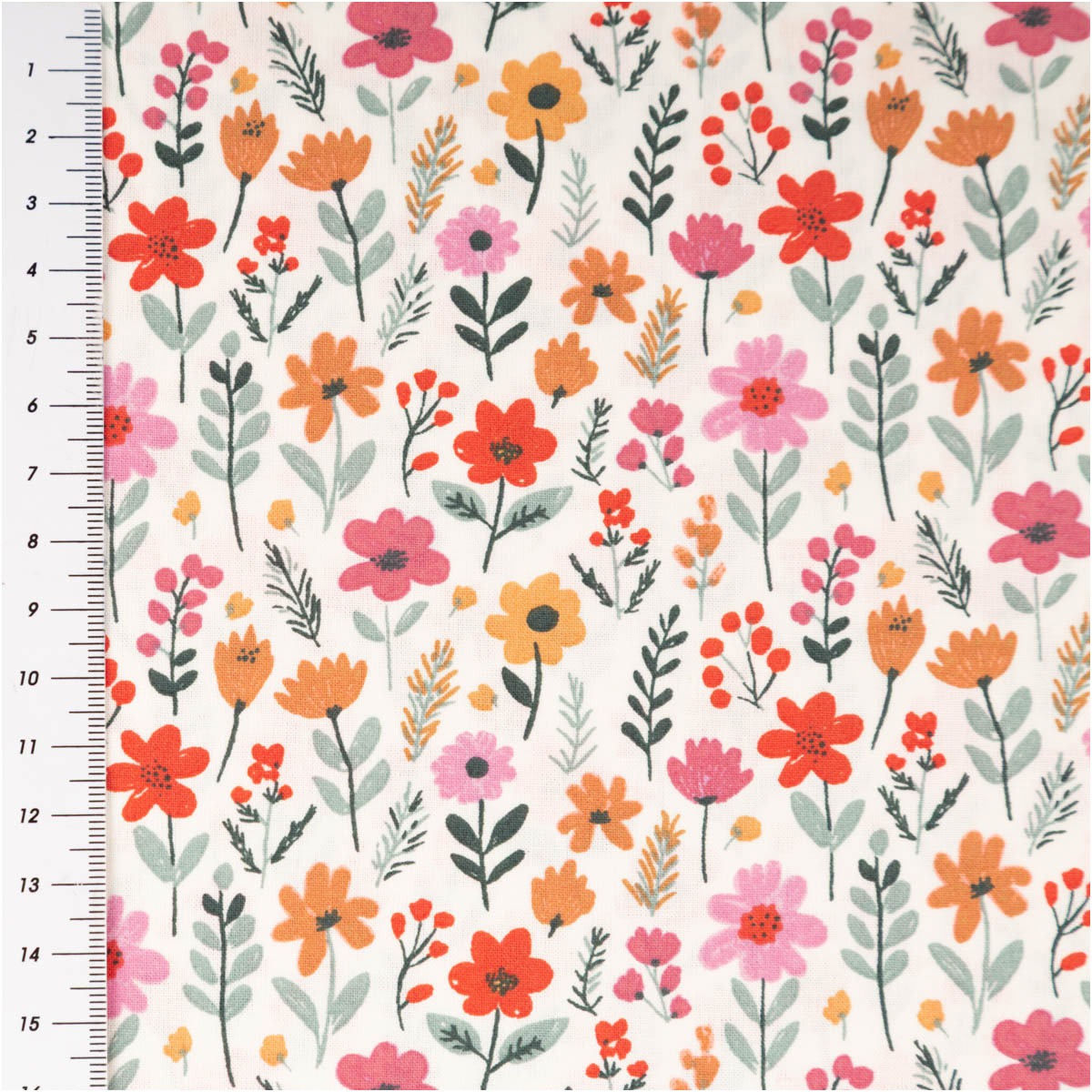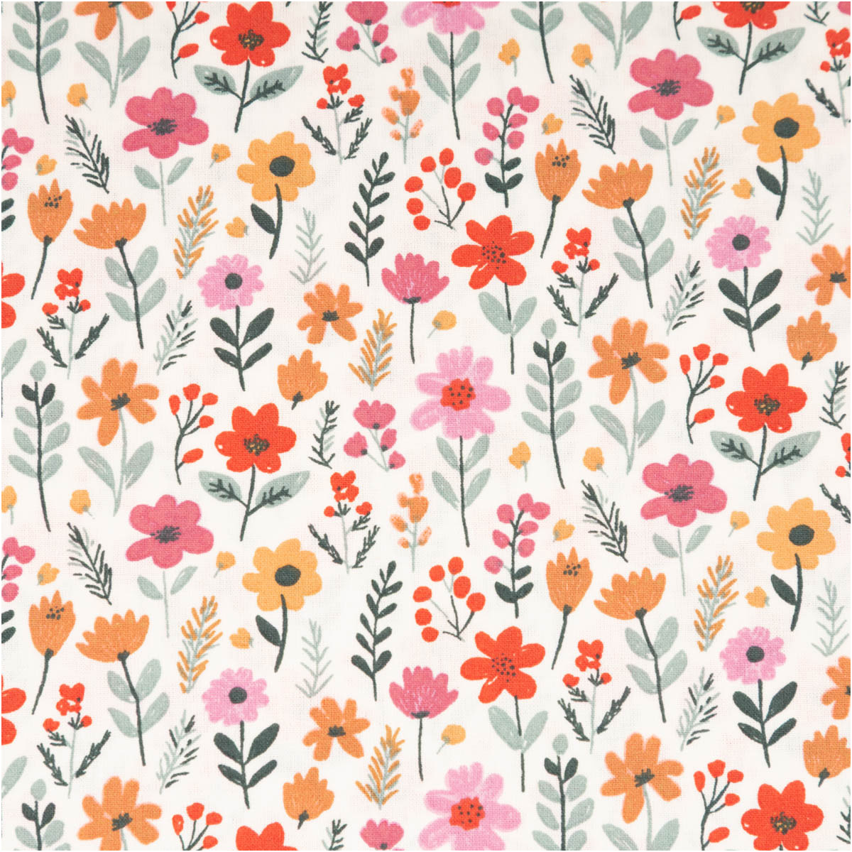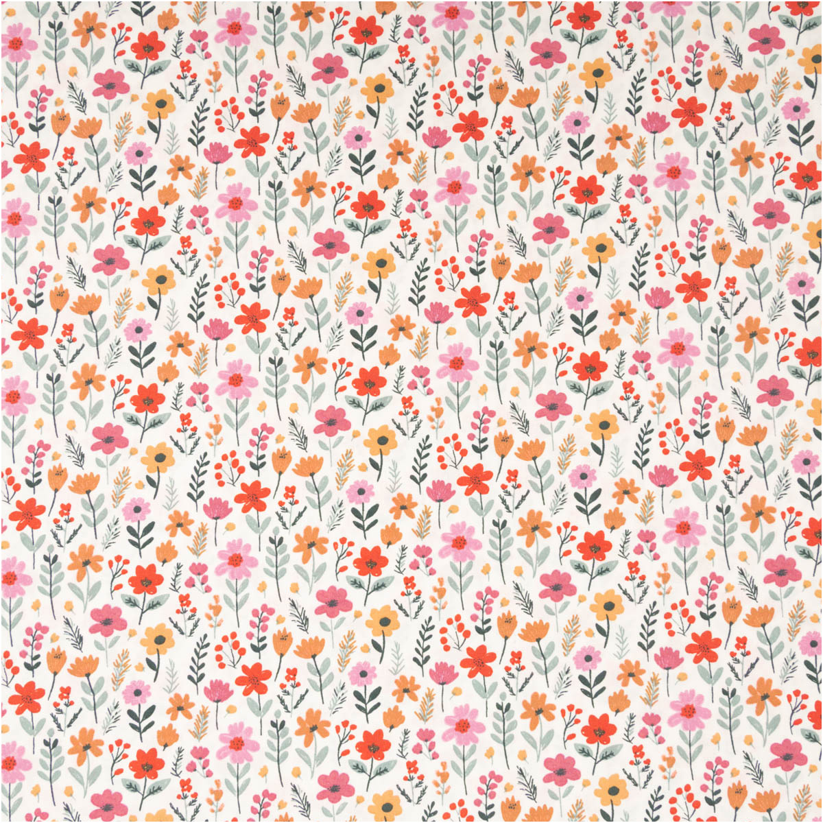 Dieser Baumwollstoff zeigt ein fröhliches Allover-Blümchenmuster in Rosa, Rot, Gelb und Grün auf ecrufarbenem Grund. Das verspielte, dennoch ruhige Dessin bringt Leichtigkeit in jedes Nähprojekt und eignet sich hervorragend für Kinder, Kleidung und Wohnideen.