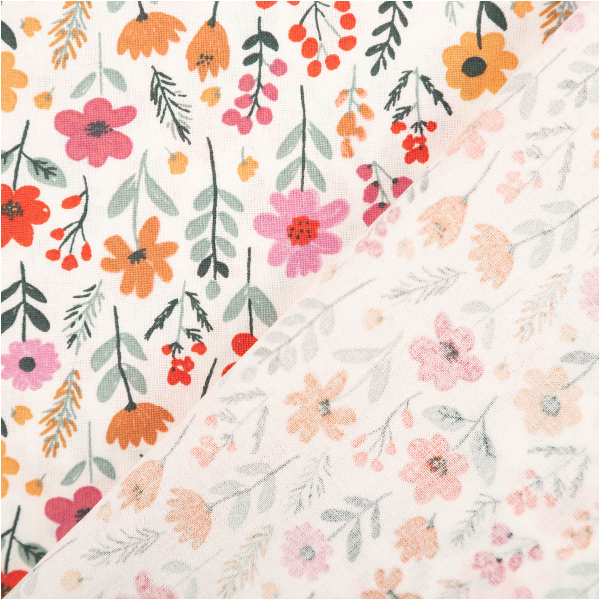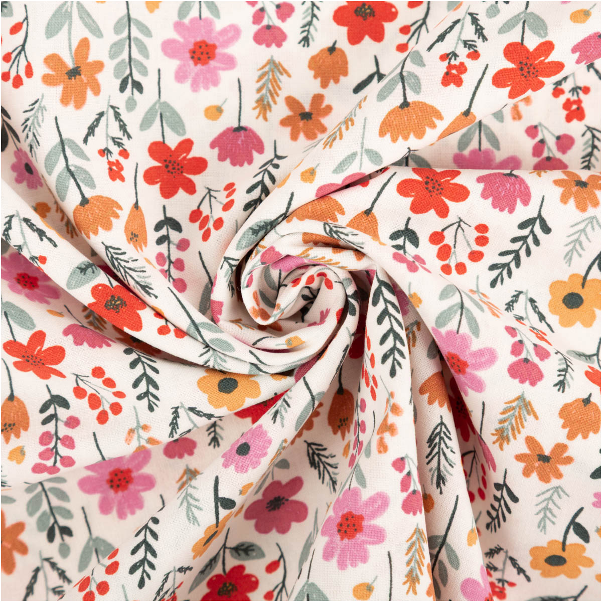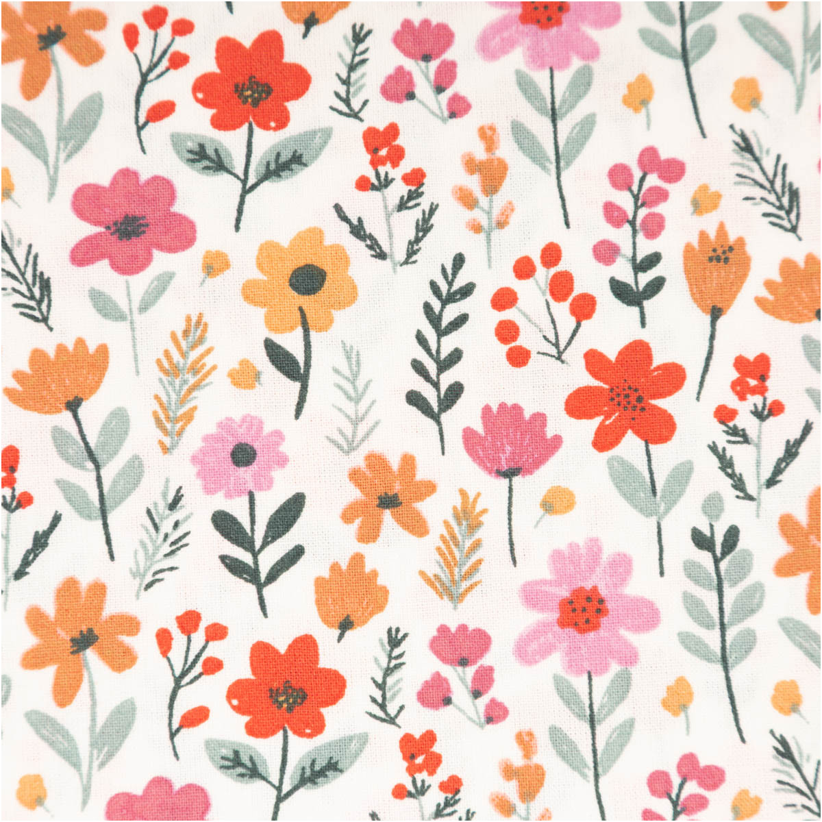 Dieser Baumwollstoff zeigt ein fröhliches Allover-Blümchenmuster in Rosa, Rot, Gelb und Grün auf ecrufarbenem Grund. Das verspielte, dennoch ruhige Dessin bringt Leichtigkeit in jedes Nähprojekt und eignet sich hervorragend für Kinder, Kleidung und Wohnideen.