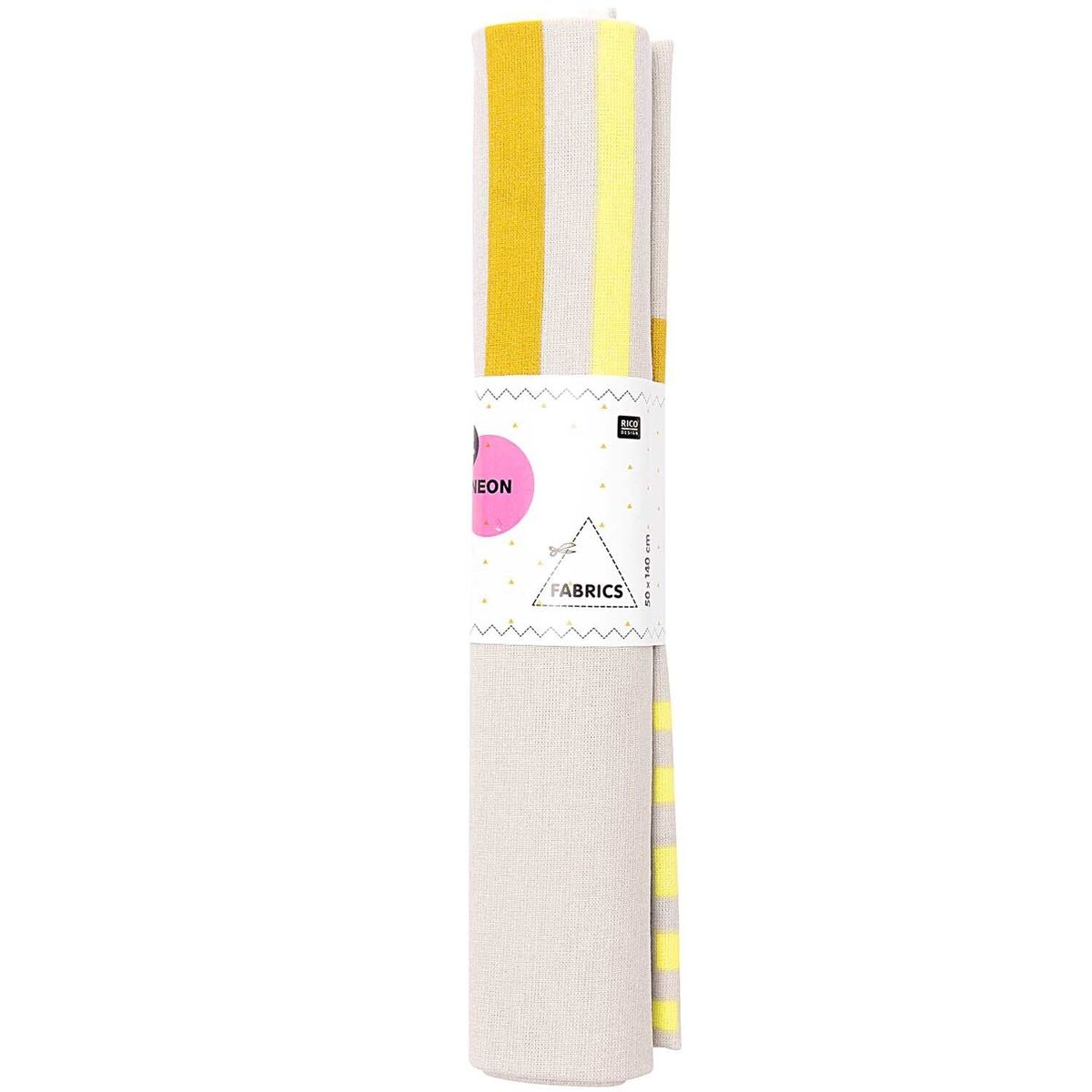 Mit dem modernen Baumwollstoff Okina Hana von Rico Design bringst du frische Akzente in deine Nähprojekte. Der Stoff kombiniert ein grafisches Linienmuster in blau, rosa und neongelb auf beigem Grund – perfekt für trendbewusste DIY-Ideen im modernen Wohnstil.