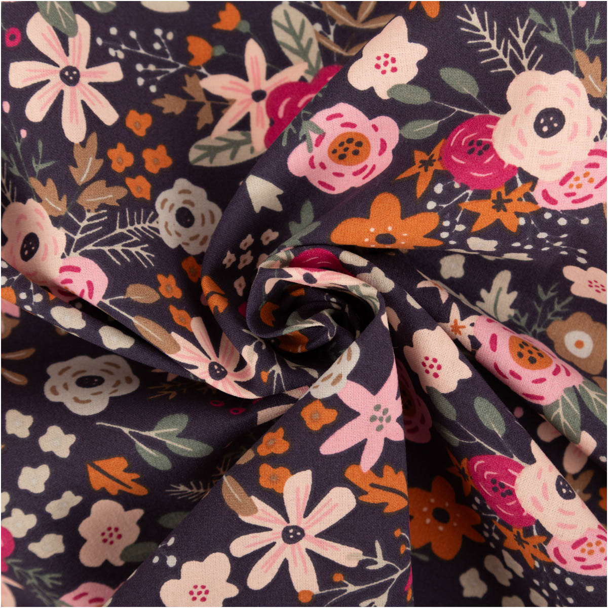 Der Baumwollstoff Olga begeistert mit einem exklusiven, in Frankreich entworfenen Blumendessin in Dunkelblau und Rosa. Die glatte Webware aus 100 % Baumwolle fühlt sich weich an, ist atmungsaktiv und hautfreundlich – ideal für Mode, Accessoires und Wohnen.