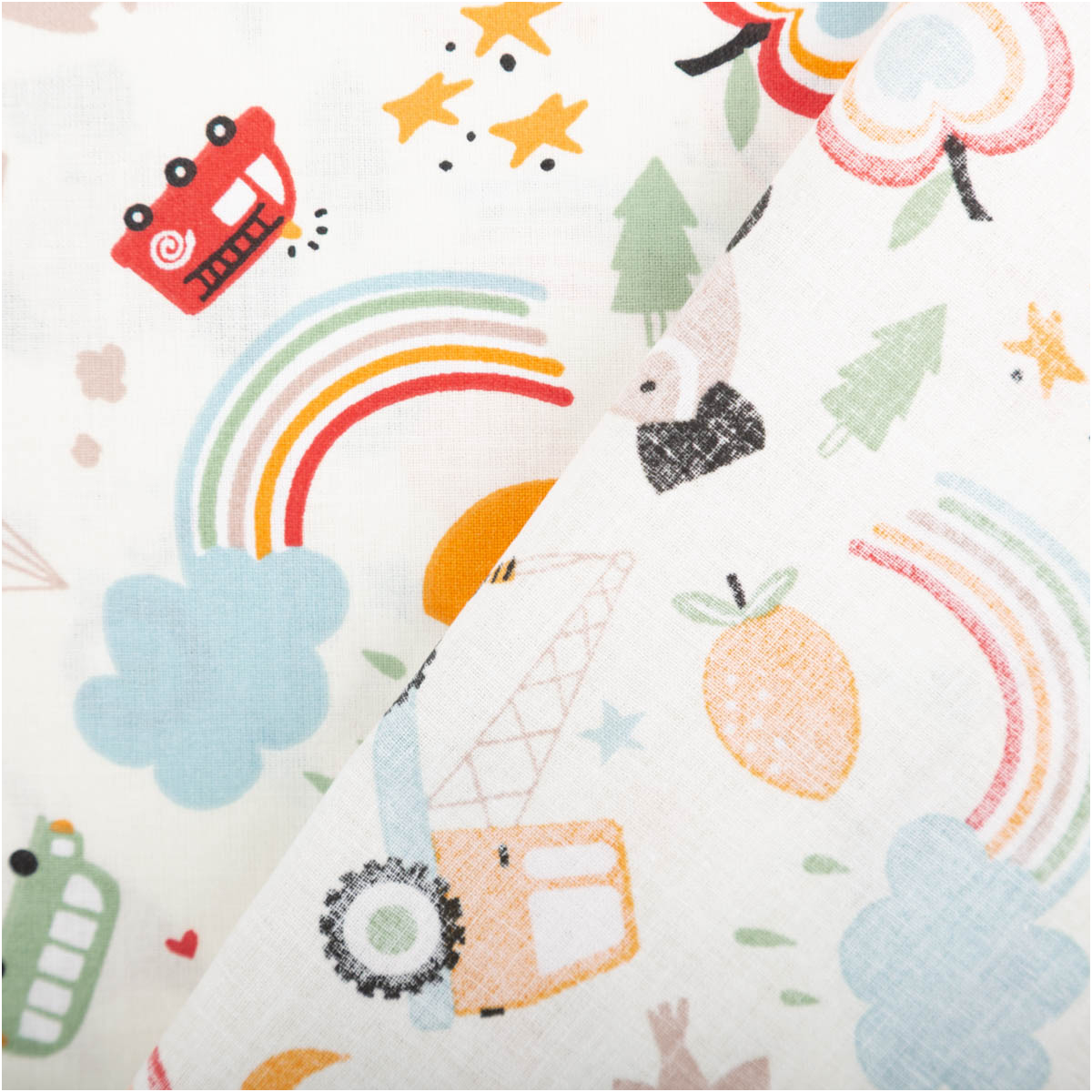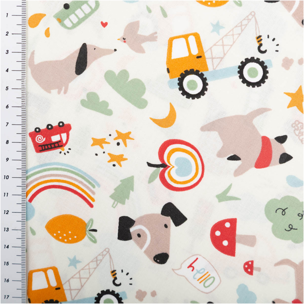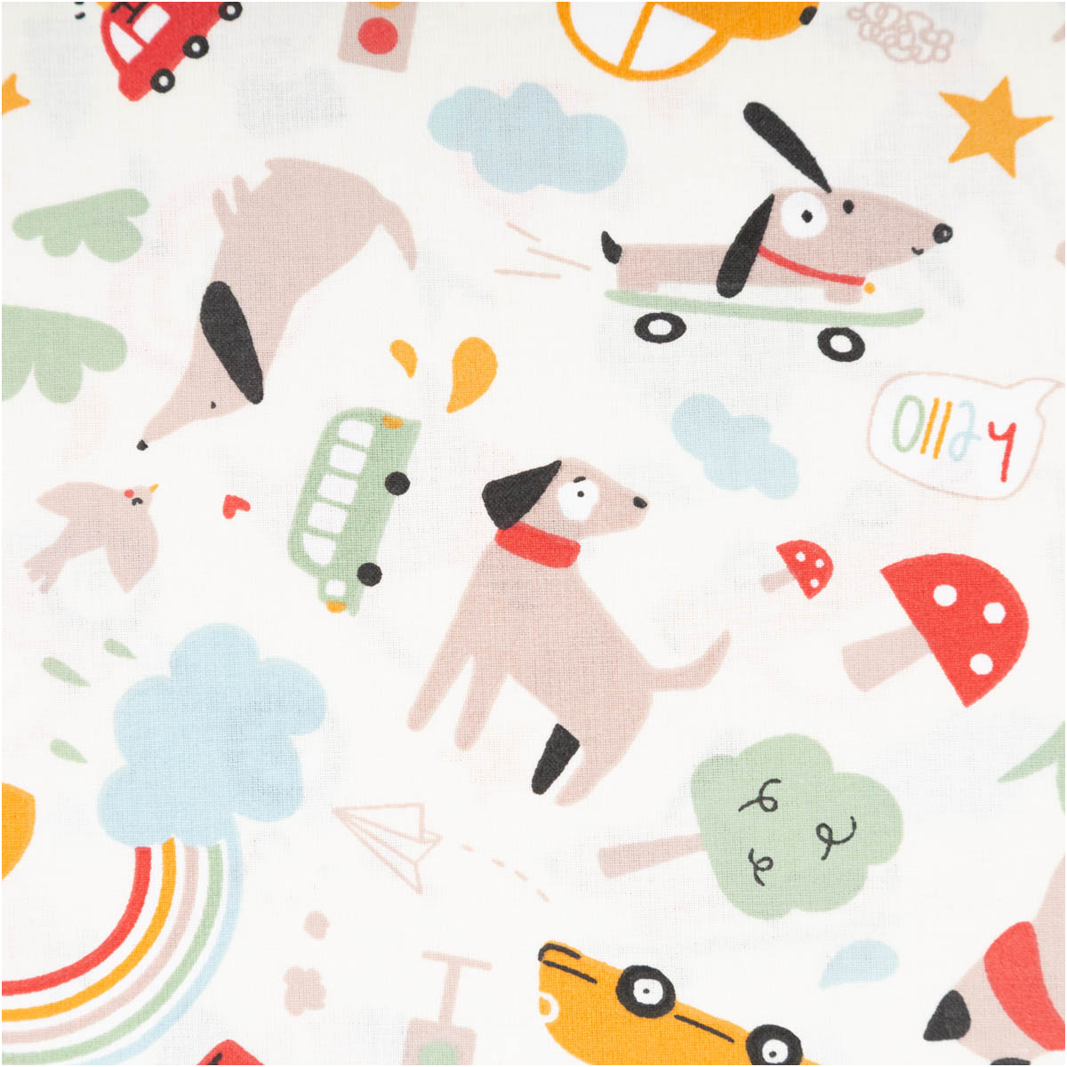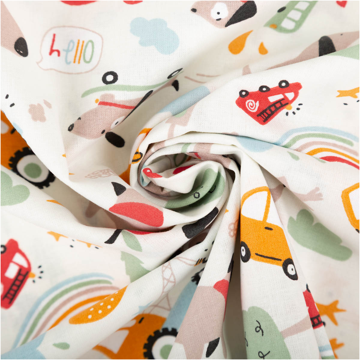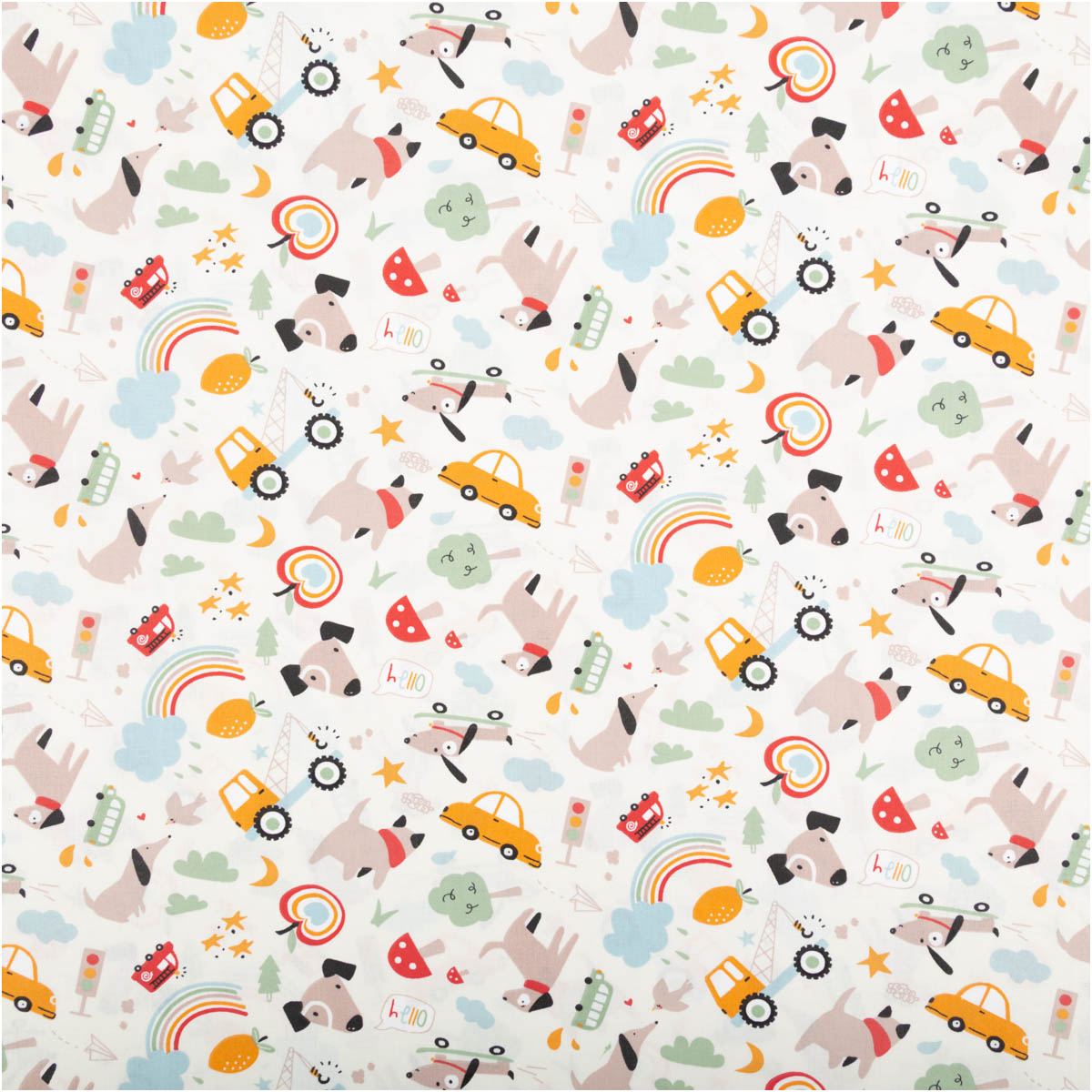 Dieser fröhliche Baumwollstoff stammt aus einem exklusiven französischen Dessin und verzaubert mit einer liebevoll gestalteten Motivwelt. Verspielte Hunde, bunte Fahrzeuge, Regenbögen und kleine Naturmotive auf beigem Hintergrund sorgen für gute Laune und eignen sich perfekt für kreative Kinder- und Familienprojekte. Dank seiner hochwertigen Qualität aus 100 % Baumwolle ist der Stoff hautfreundlich, atmungsaktiv und schadstoffgeprüft – ideal auch für Baby- und Kinderkleidung.