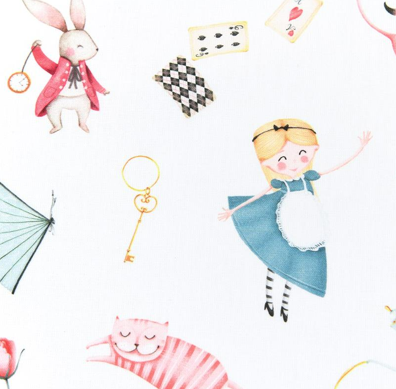 Der Baumwollstoff Wonderland begeistert mit einem liebevoll illustrierten französischen Dessin voller fantasievoller Motive wie Hase, Katze, Flamingo, Hut und verspielter Details. Auf weißem Grund wirken die bunten Illustrationen leicht, freundlich und besonders harmonisch. Die feinfädige, leichte Baumwoll-Webware fühlt sich angenehm weich an, ist atmungsaktiv und lässt sich sehr gut verarbeiten.