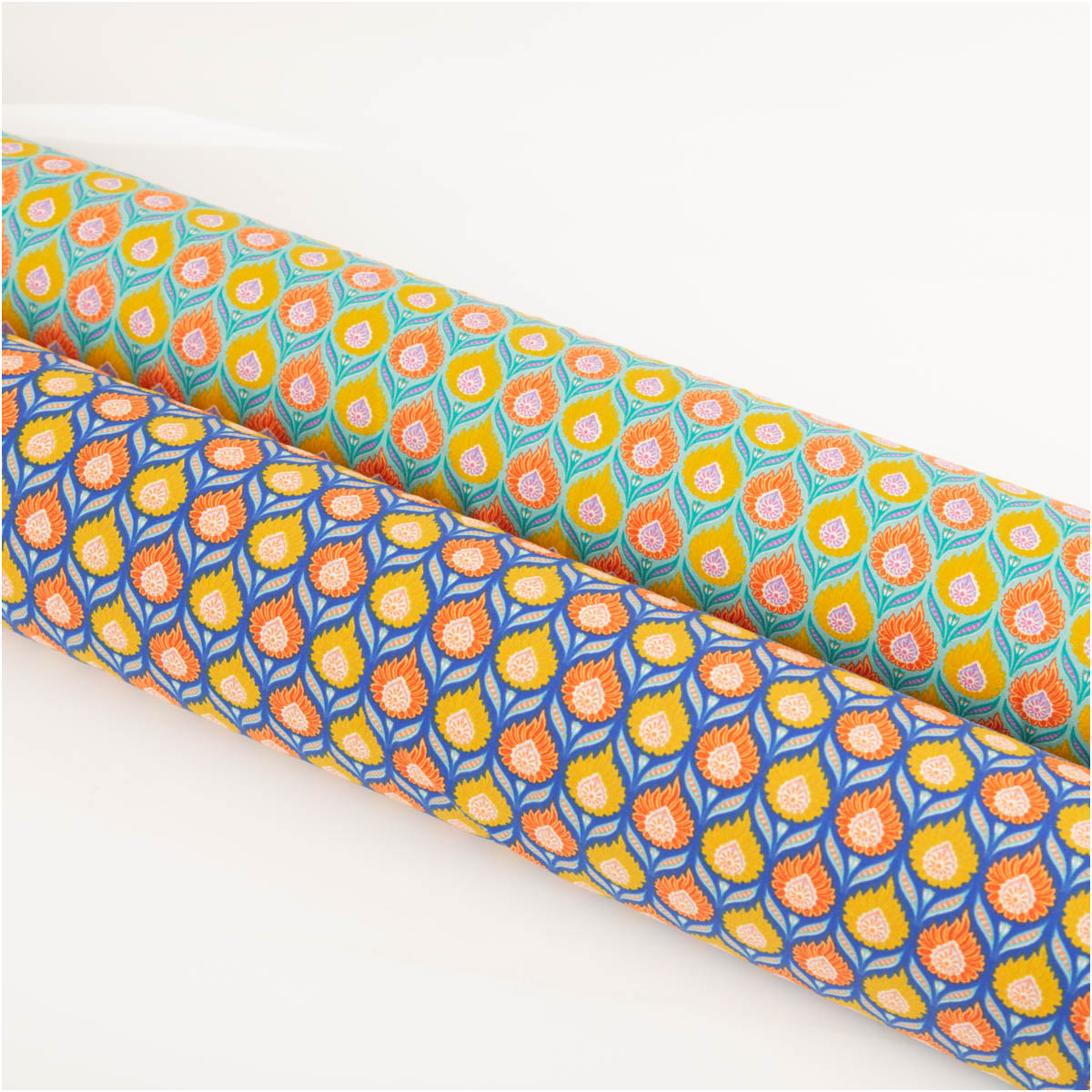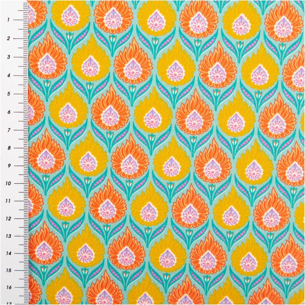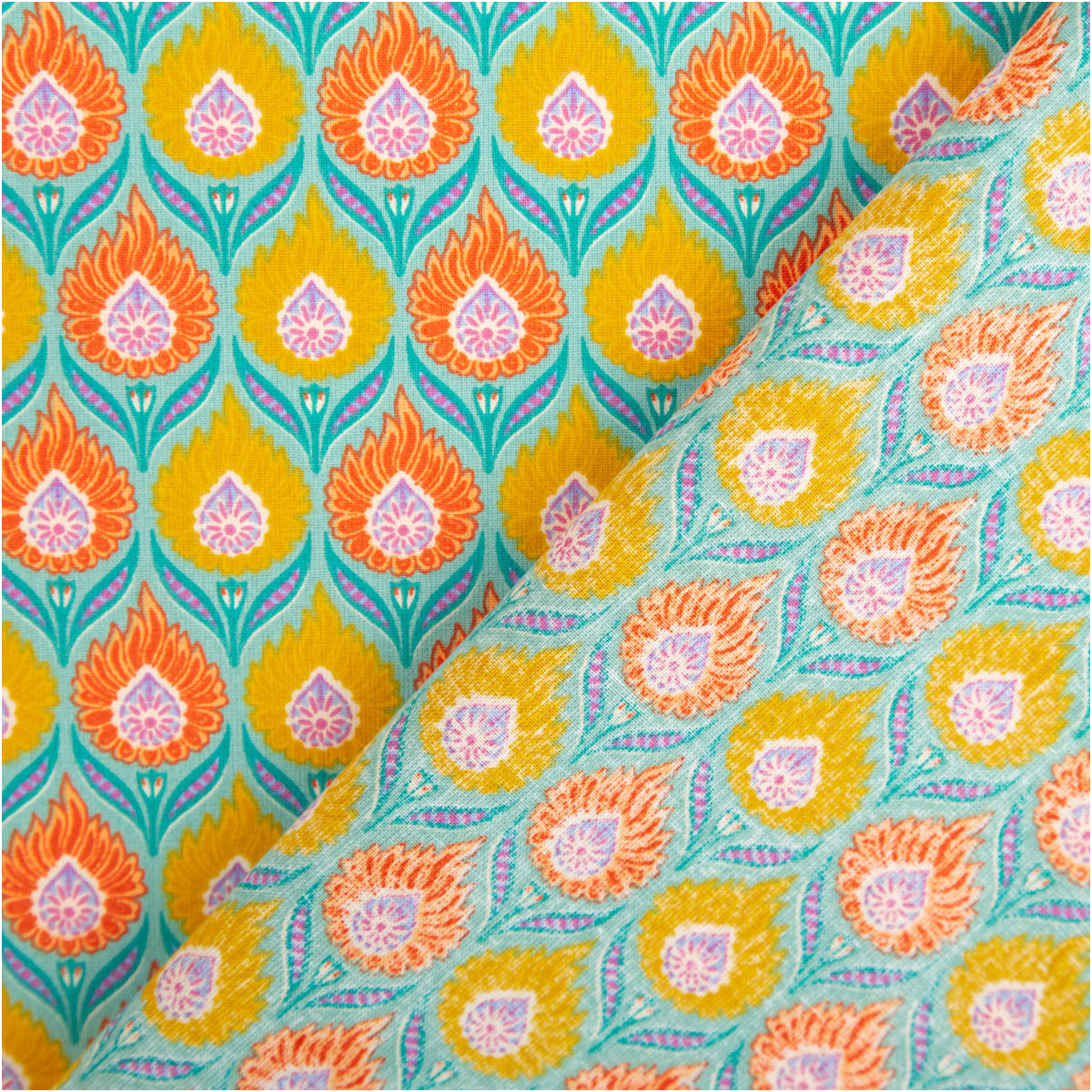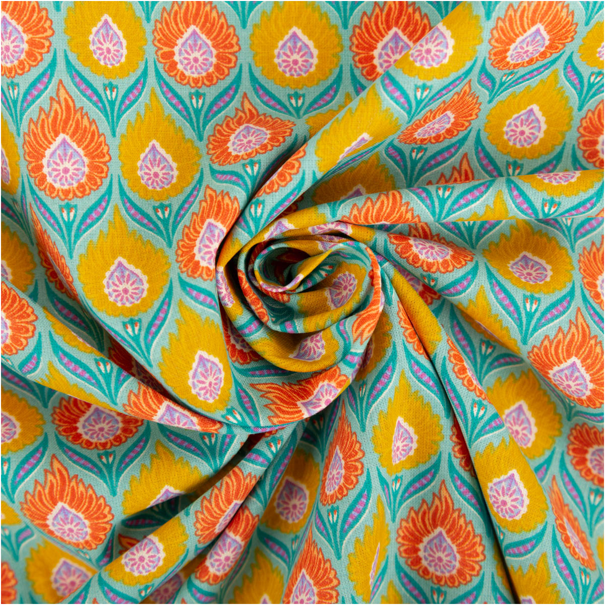 AUSDRUCKSSTARKES DESIGN: Retro Blumenmuster in Orange und Gelb auf intensiv türkisfarbigem Hintergrund für auffällige Nähprojekte