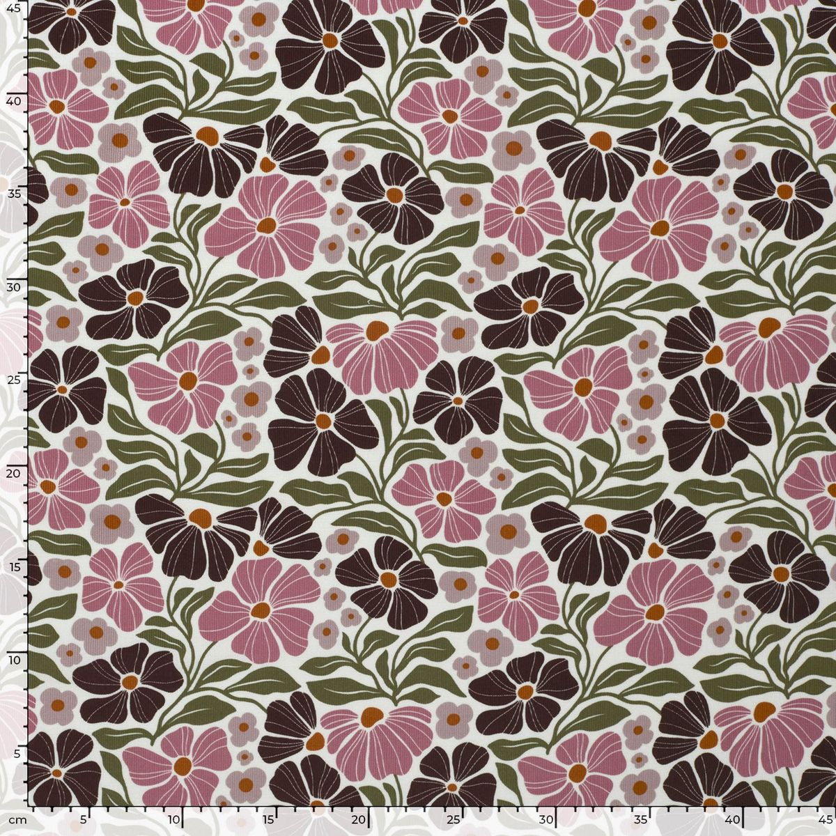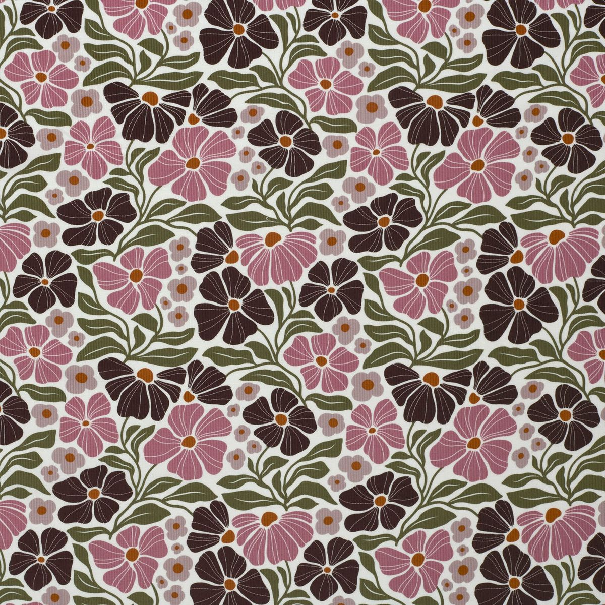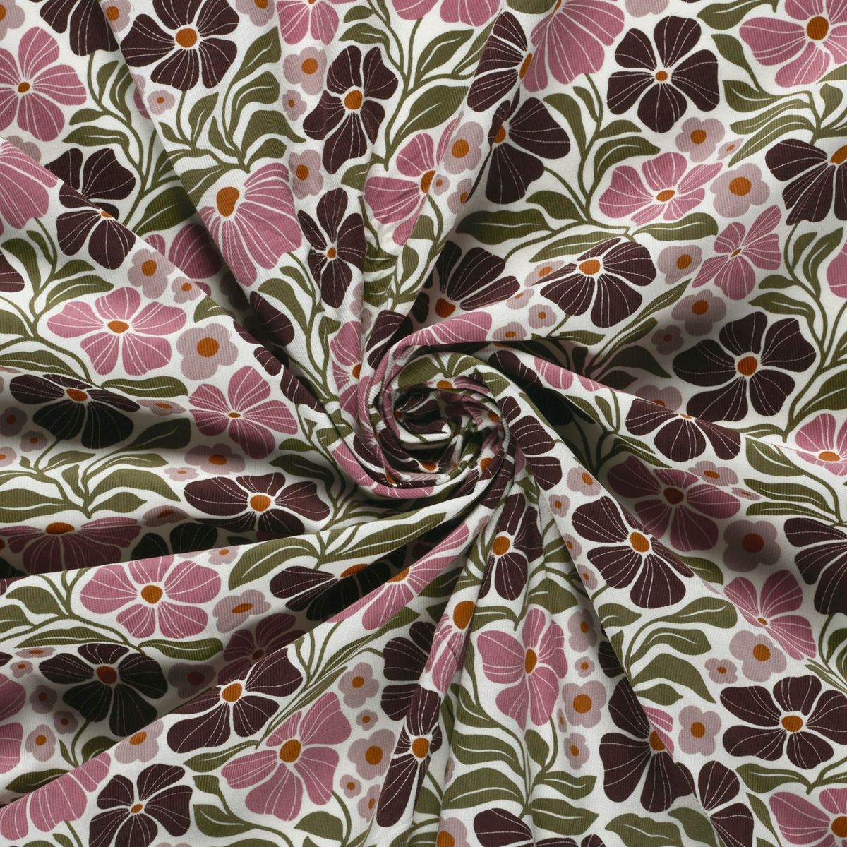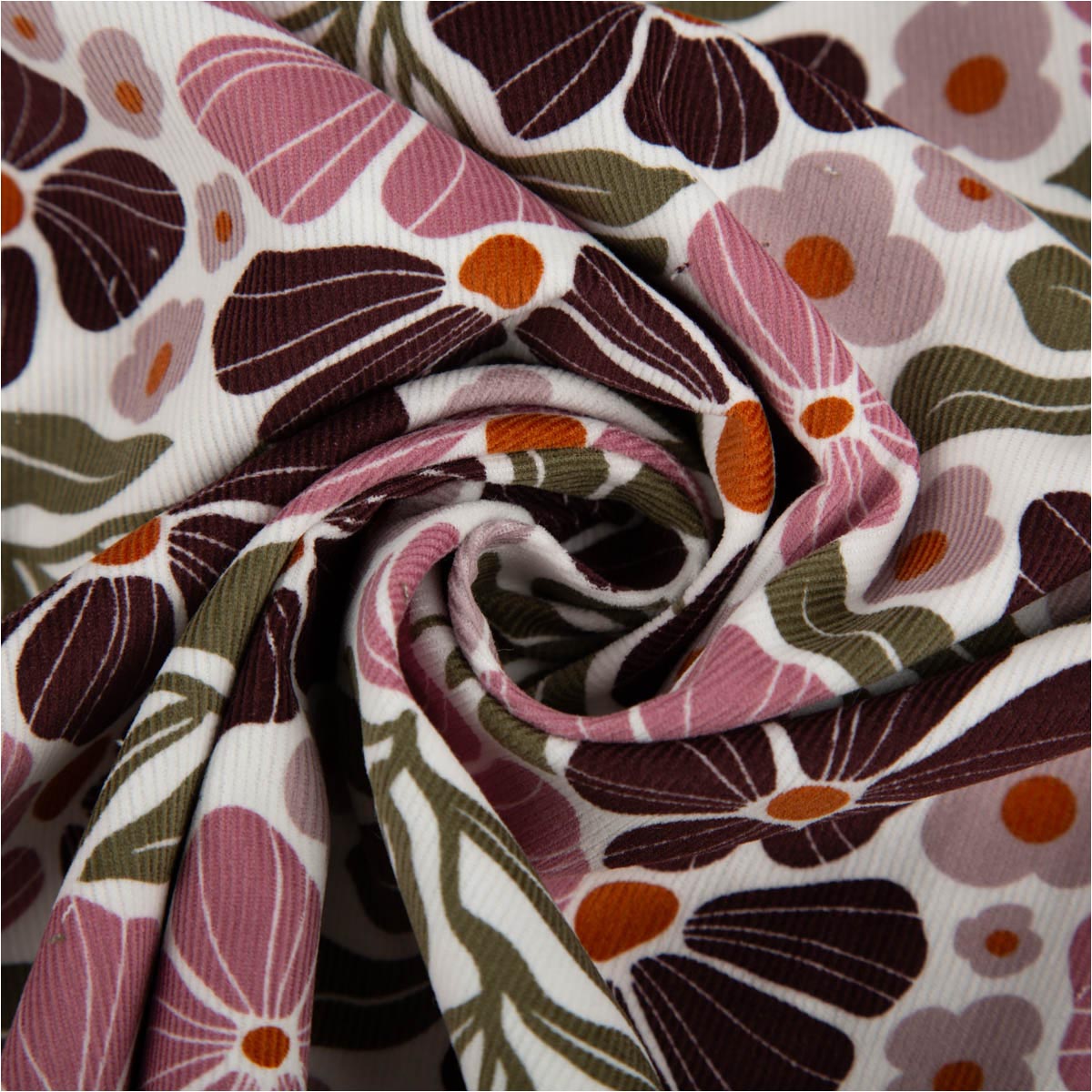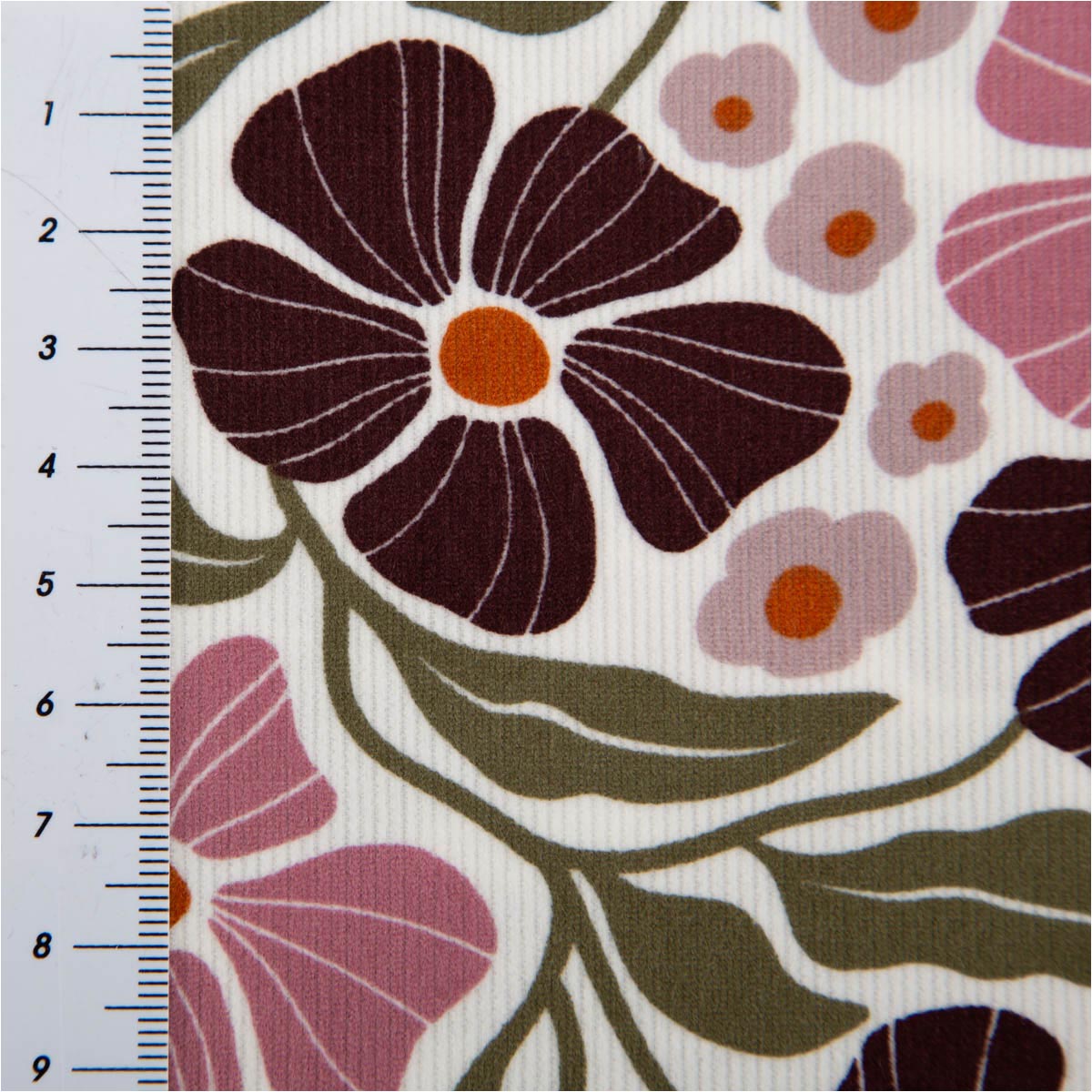 Dieser Feincord aus 100 % Baumwolle begeistert durch seine feine Rippenstruktur und das charmante Blumenmuster in Rosa, Braun und Oliv auf wollweißem Grund. Der Stoff hat einen angenehm weichen, samtigen Griff und überzeugt durch seine hohe Strapazierfähigkeit und Atmungsaktivität – perfekt für Bekleidung und Accessoires.