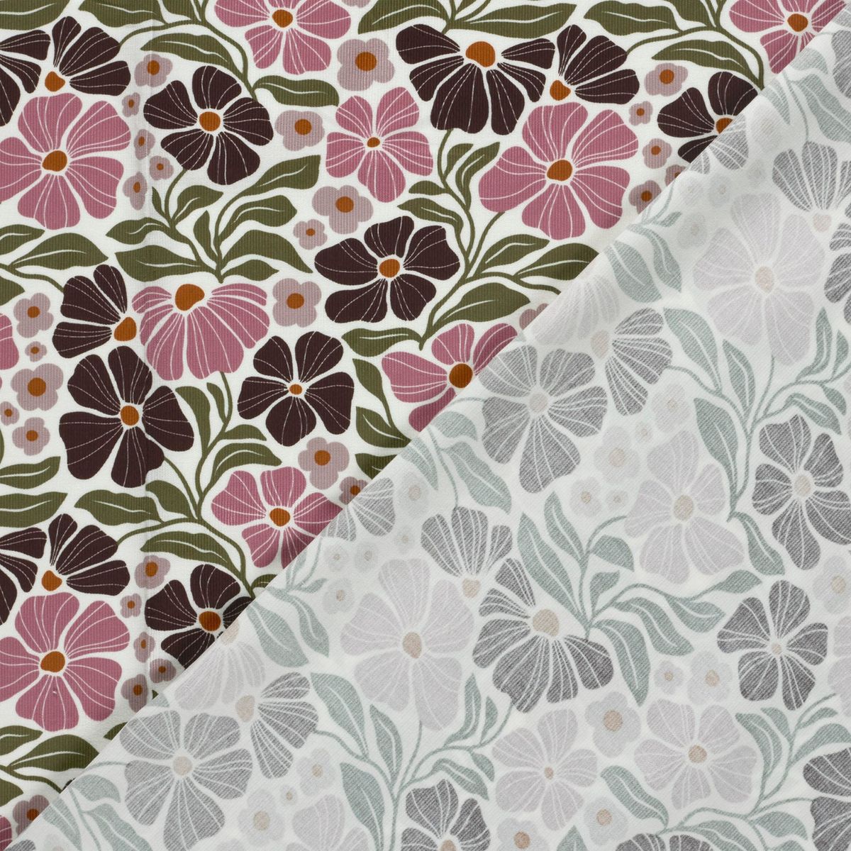 Design: Blumen in Rosa, Braun und Oliv auf wollweißem Grund