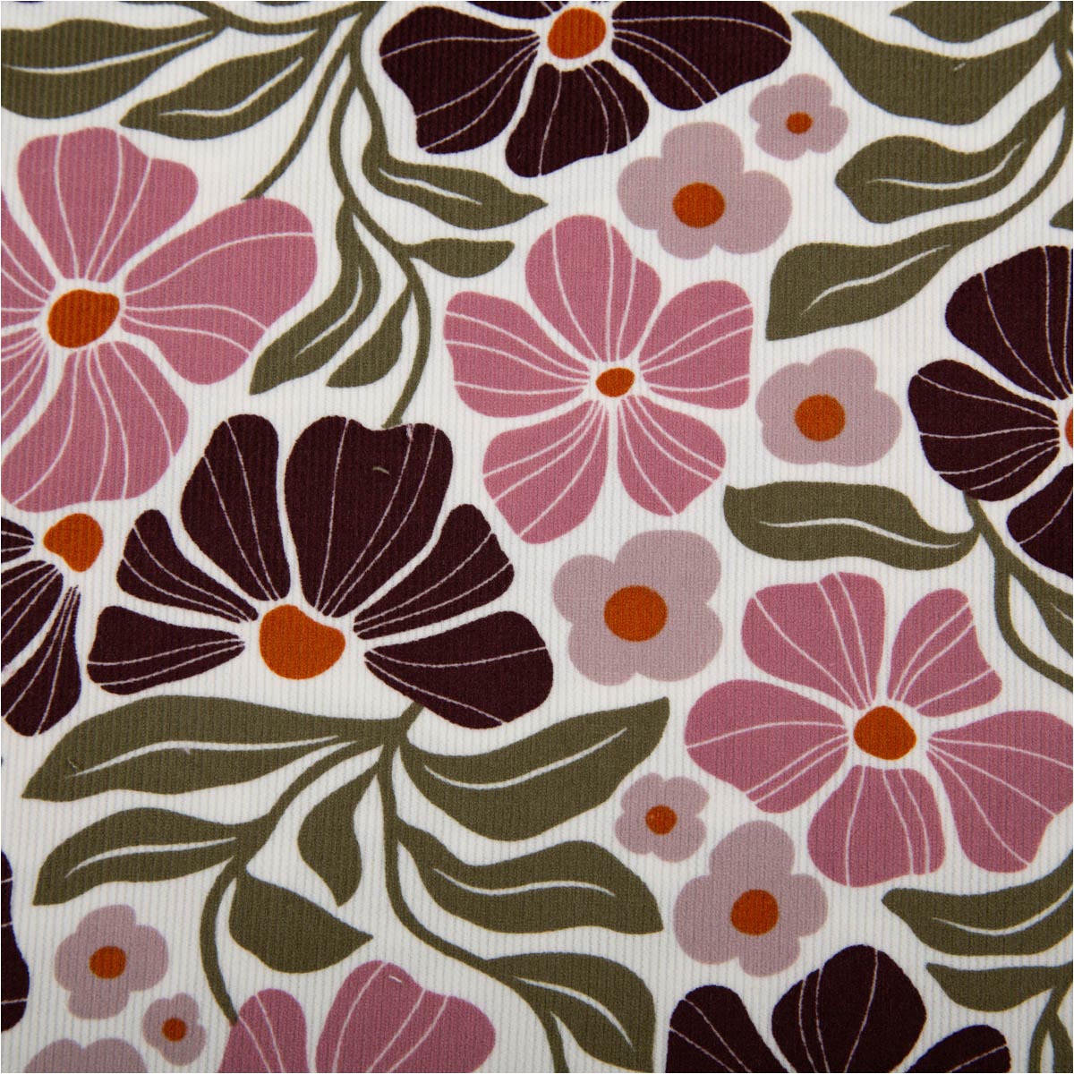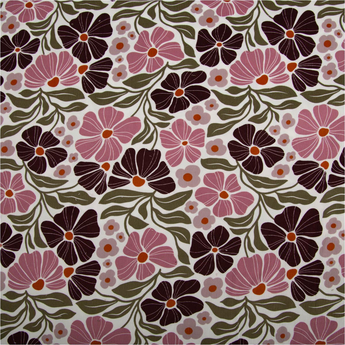 Cord Stoff Feincord 21W Baumwolle mit Blumen wollweiß rosa aubergine grün 1,44m Breite