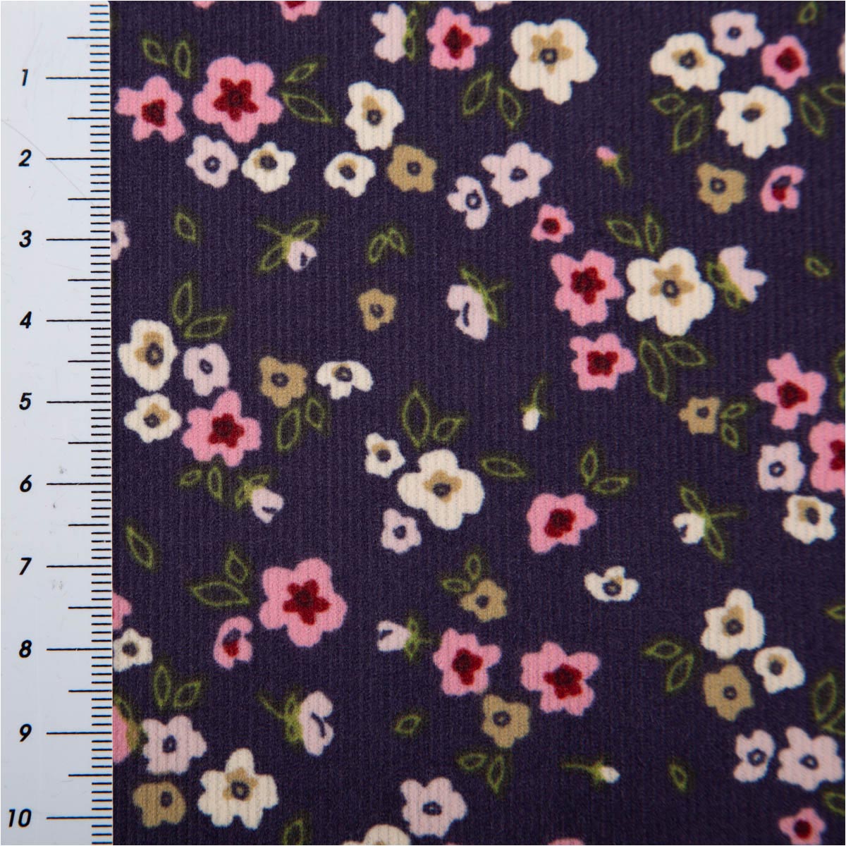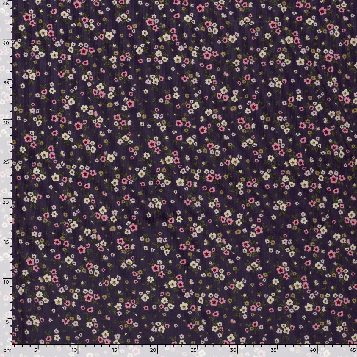 Dieser Feincord aus 100 % Baumwolle begeistert mit seinem romantischen Streublümchen-Design in Rosa, Weiß und Grün auf auberginefarbenem Grund. Der Stoff hat eine feine Rippenstruktur (21W) mit samtigem Griff, ist atmungsaktiv, strapazierfähig und angenehm auf der Haut – ideal für Bekleidung, Accessoires und Deko.