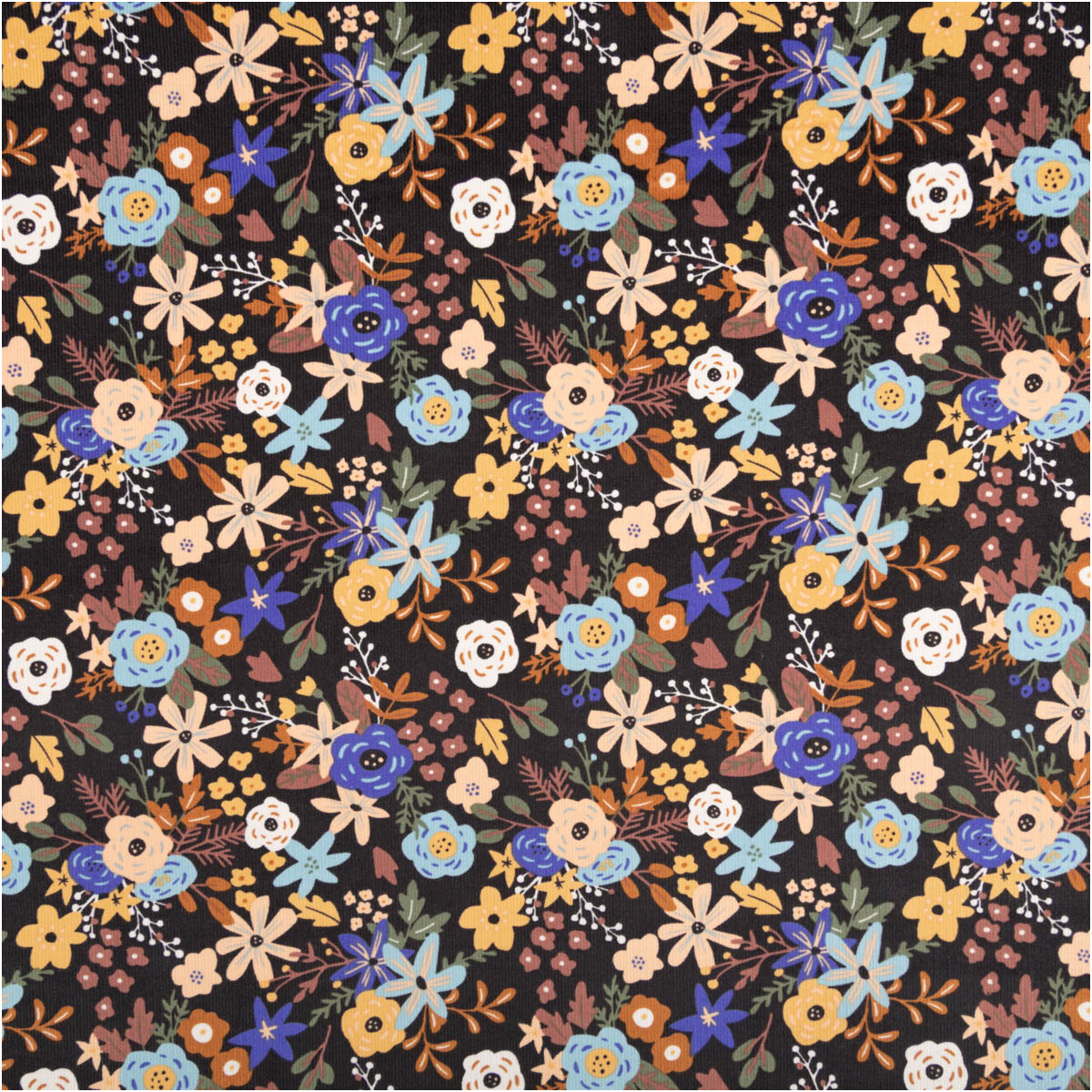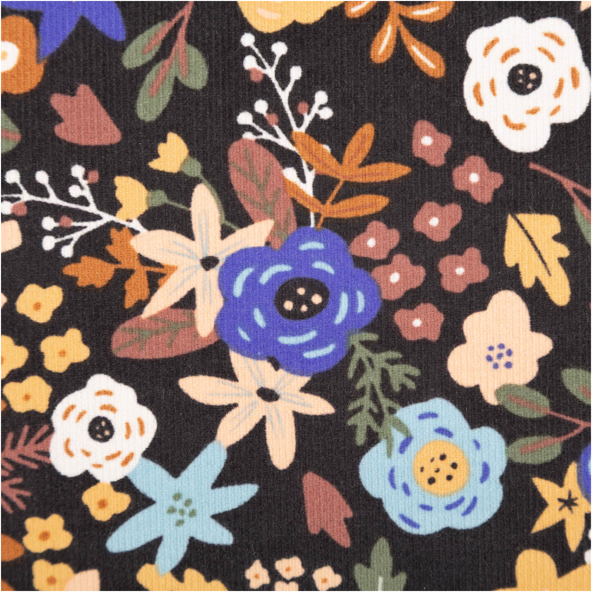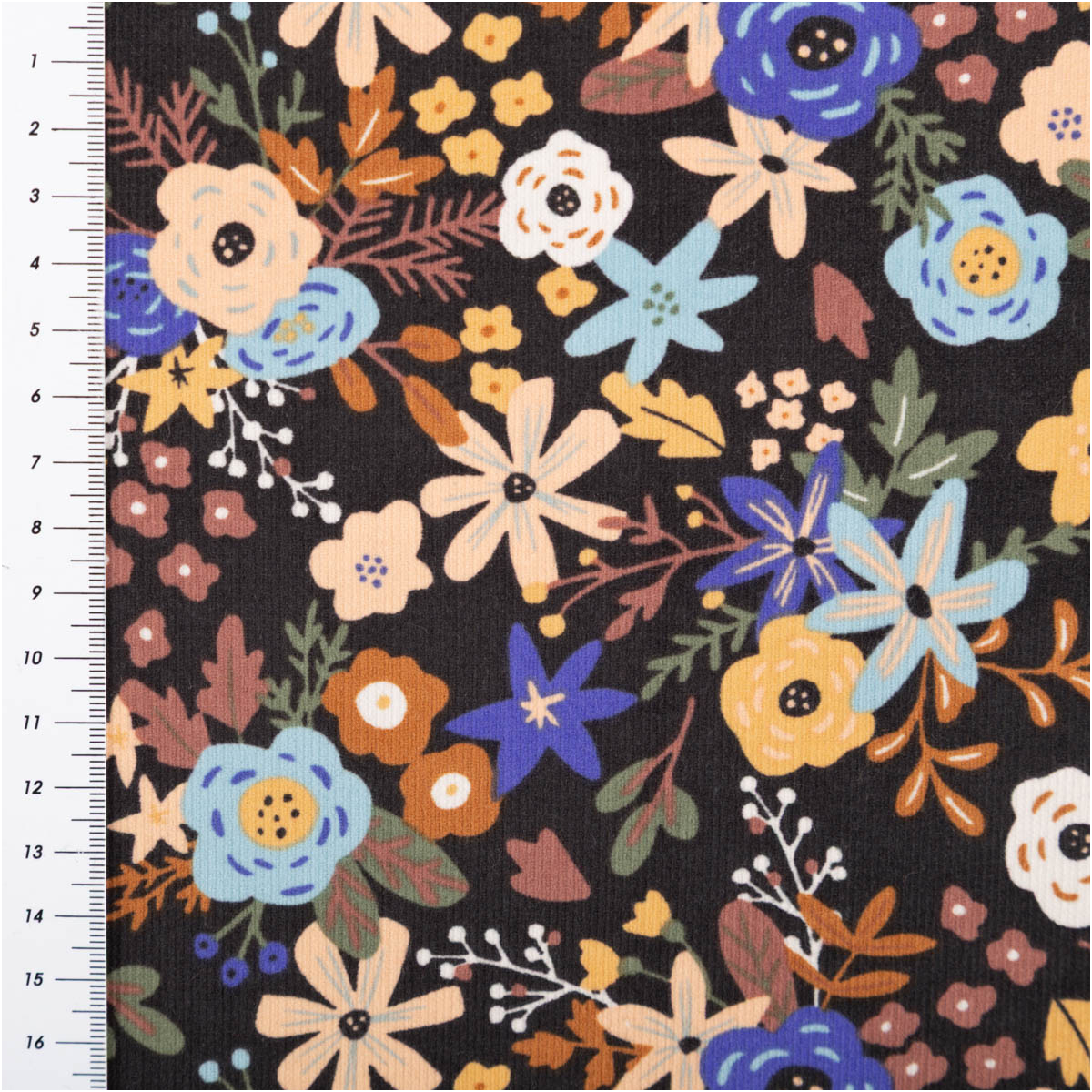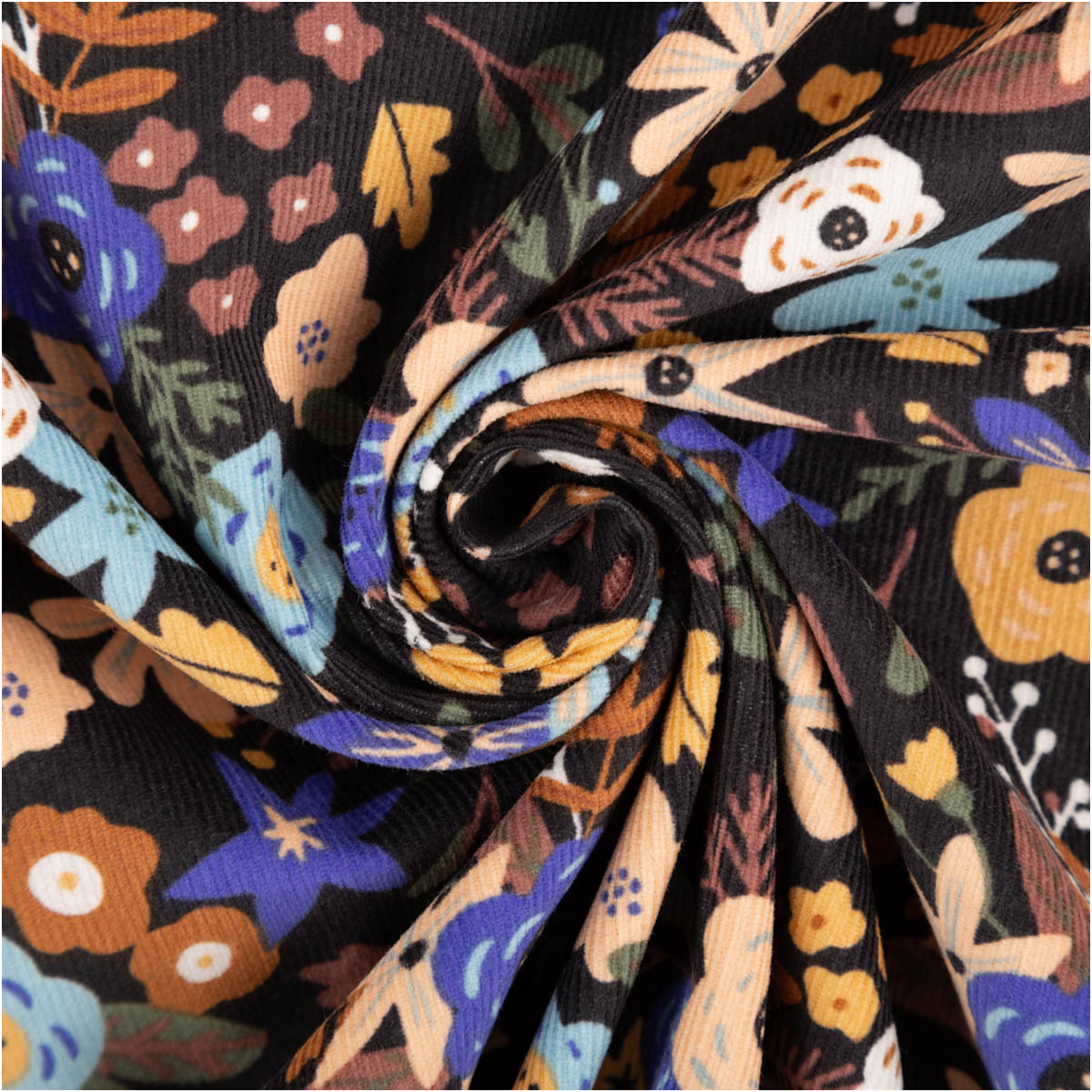 Dieser wunderschöne Feincord Stoff begeistert mit einem Blümchen-Dessin in warmen Farben auf dunkelblauem Grund. Die typische Cordrillenstruktur sorgt für den unverwechselbaren Look, während der Stoff samtig-weich in der Hand liegt.