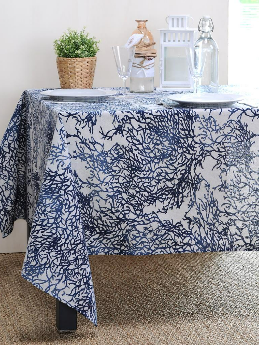 Robuster Baumwoll-Dekostoff mit Korallenmotiv in Natur und Blau