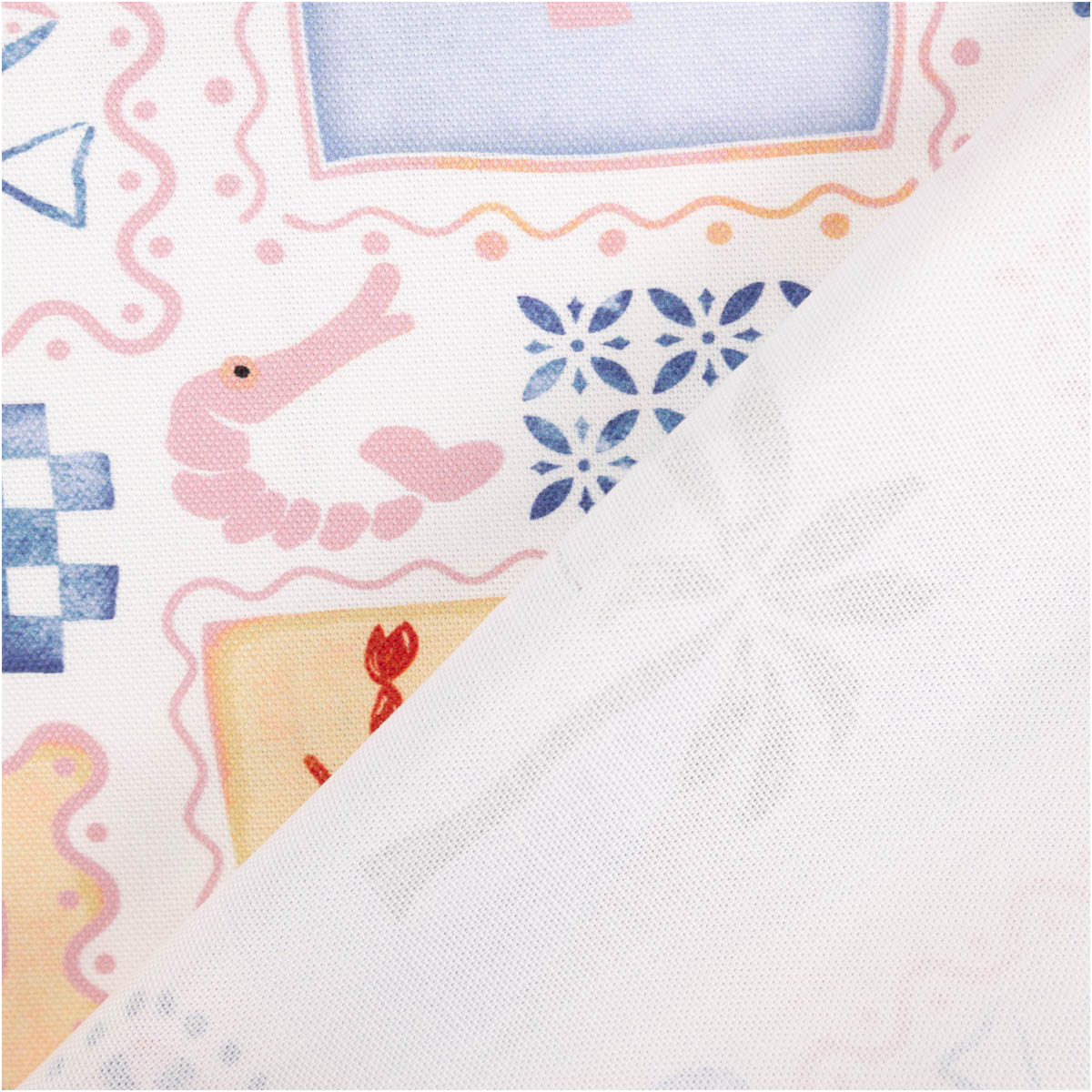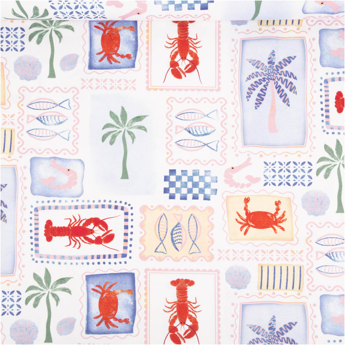 MARITIMES PATCHWORK-DESIGN: Sommerliche Küstenmotive in weiß, blau und rot – Fische, Hummer, Seesterne und Musterflächen für echten Urlaubslook.
