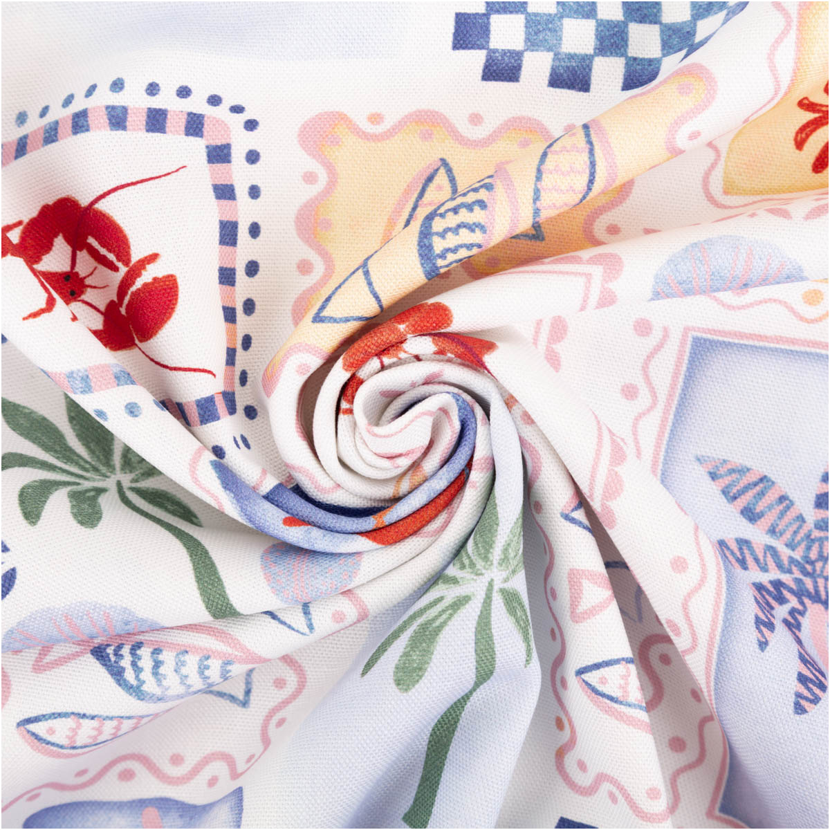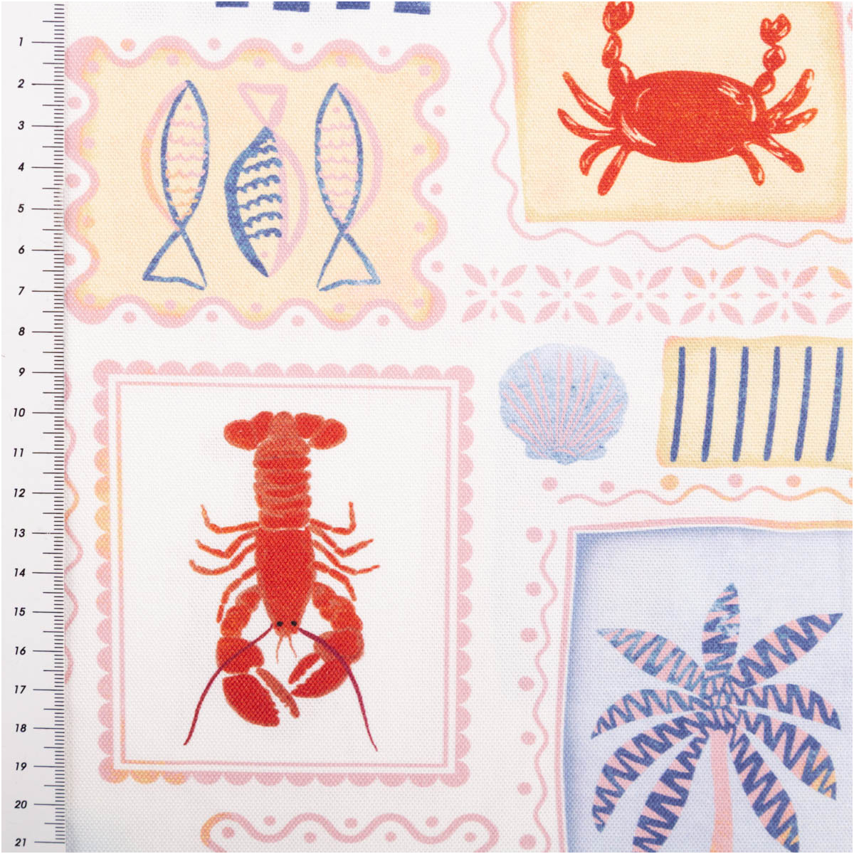 Du möchtest sofort Küstenfeeling auf dem Nähtisch? Dieser Canvas Baumwollstoff im maritimen Sommer-Patchwork kombiniert typische Motive wie Fische, Hummer, Seesterne und dekorative Musterflächen zu einem frischen Design in weiß, blau und rot. Perfekt für alles, was nach Strand, Boot und Ferienhaus aussehen soll.