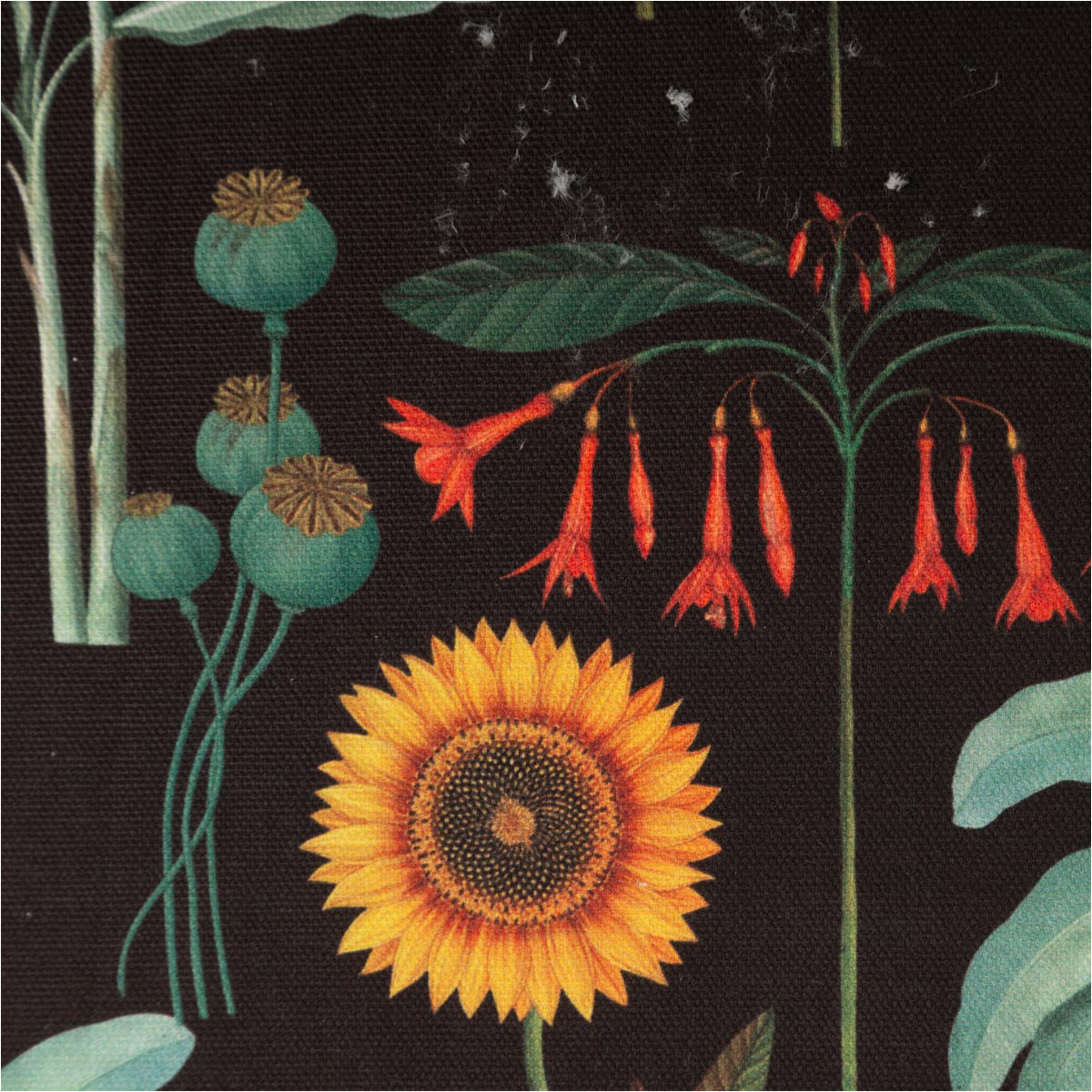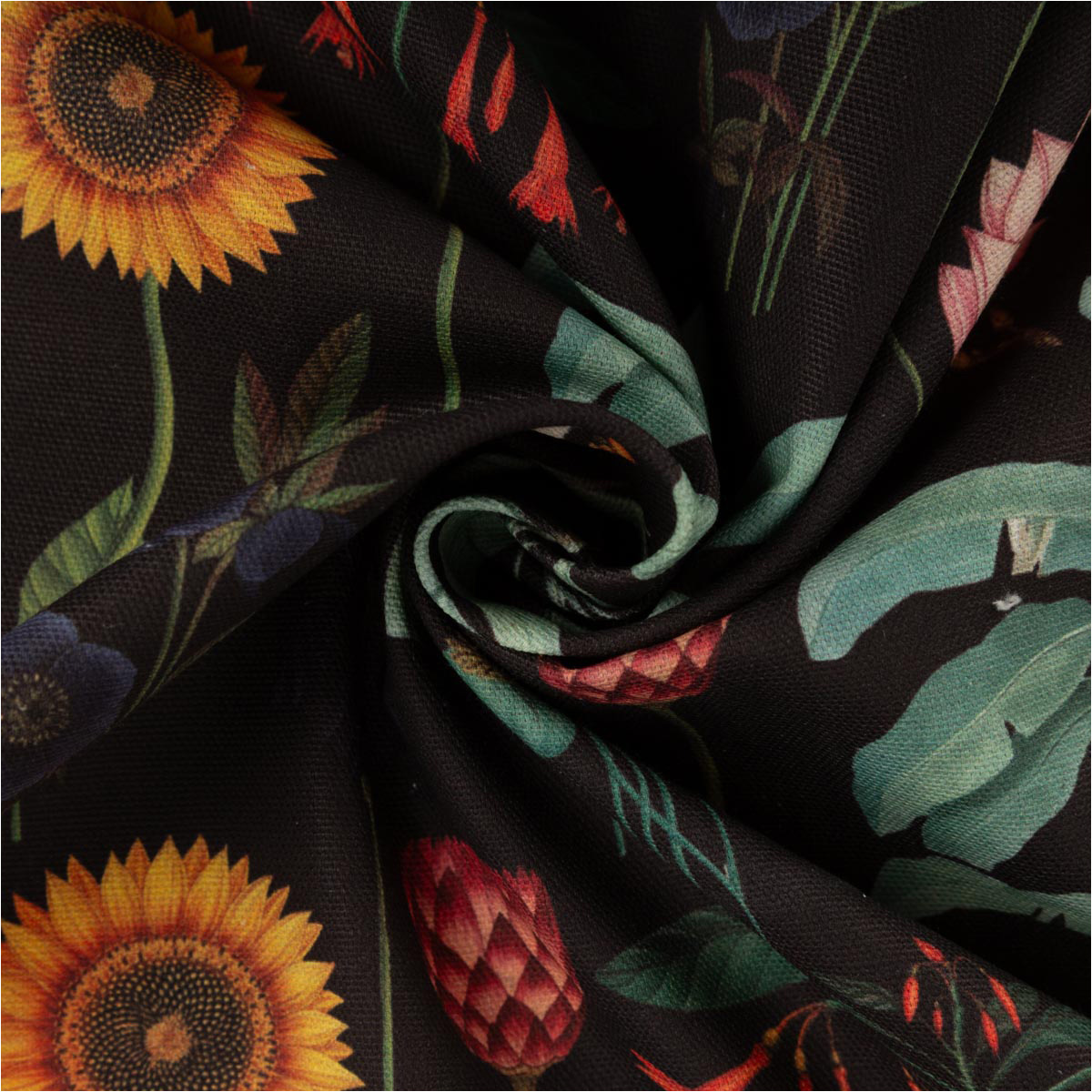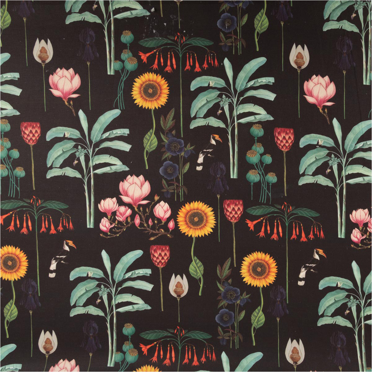 Dieser hochwertige Baumwollstoff in Halbpanama-Qualität verbindet kräftige Farben, exotische Motive und robuste Stoffstruktur. Die detailreichen Blumen, Palmenblätter und tropischen Elemente kommen auf dem tiefschwarzen Hintergrund besonders intensiv zur Geltung. Neben Sonnenblumen und Magnolien findest du auch seltene exotische Blüten – ein echter Hingucker für moderne Wohnideen.