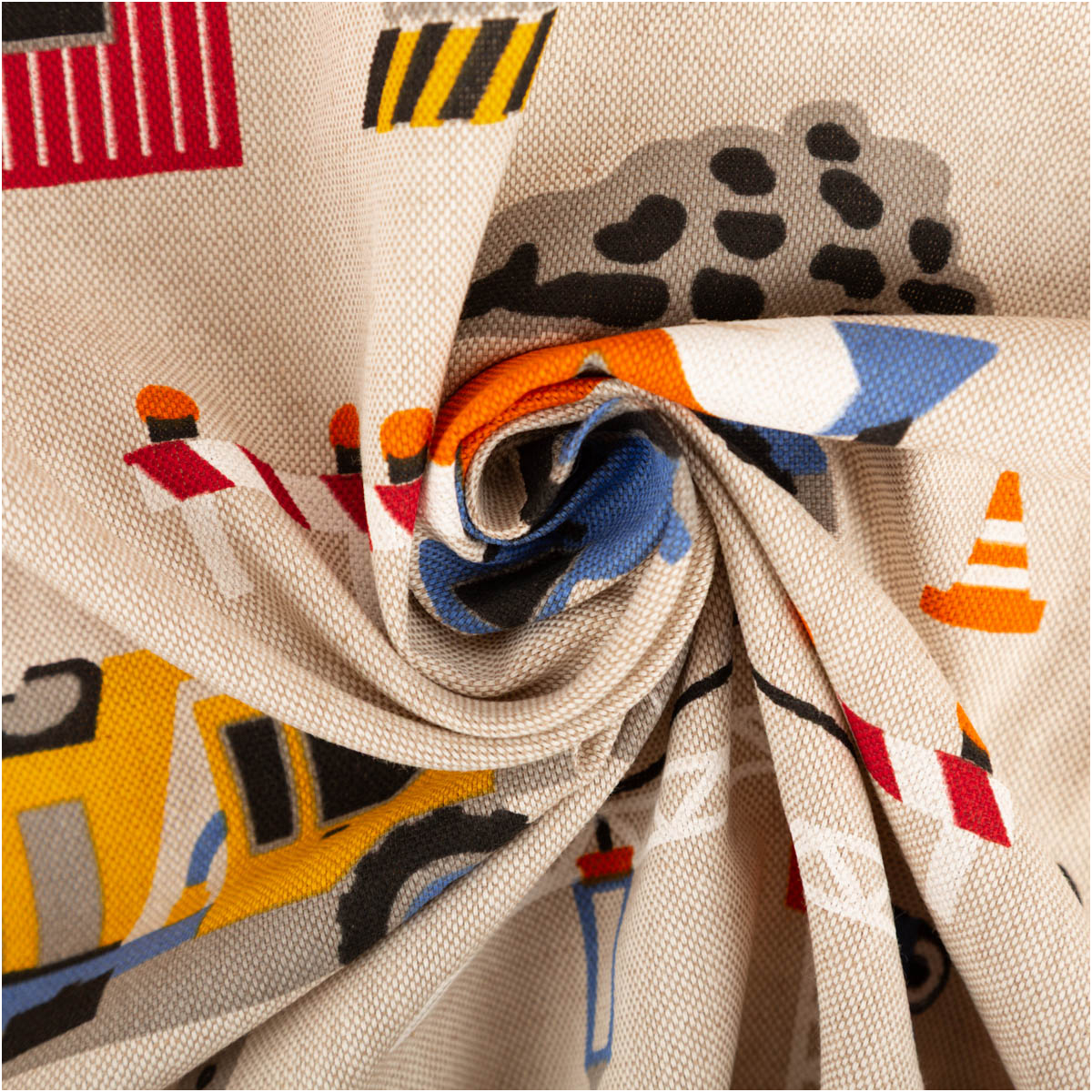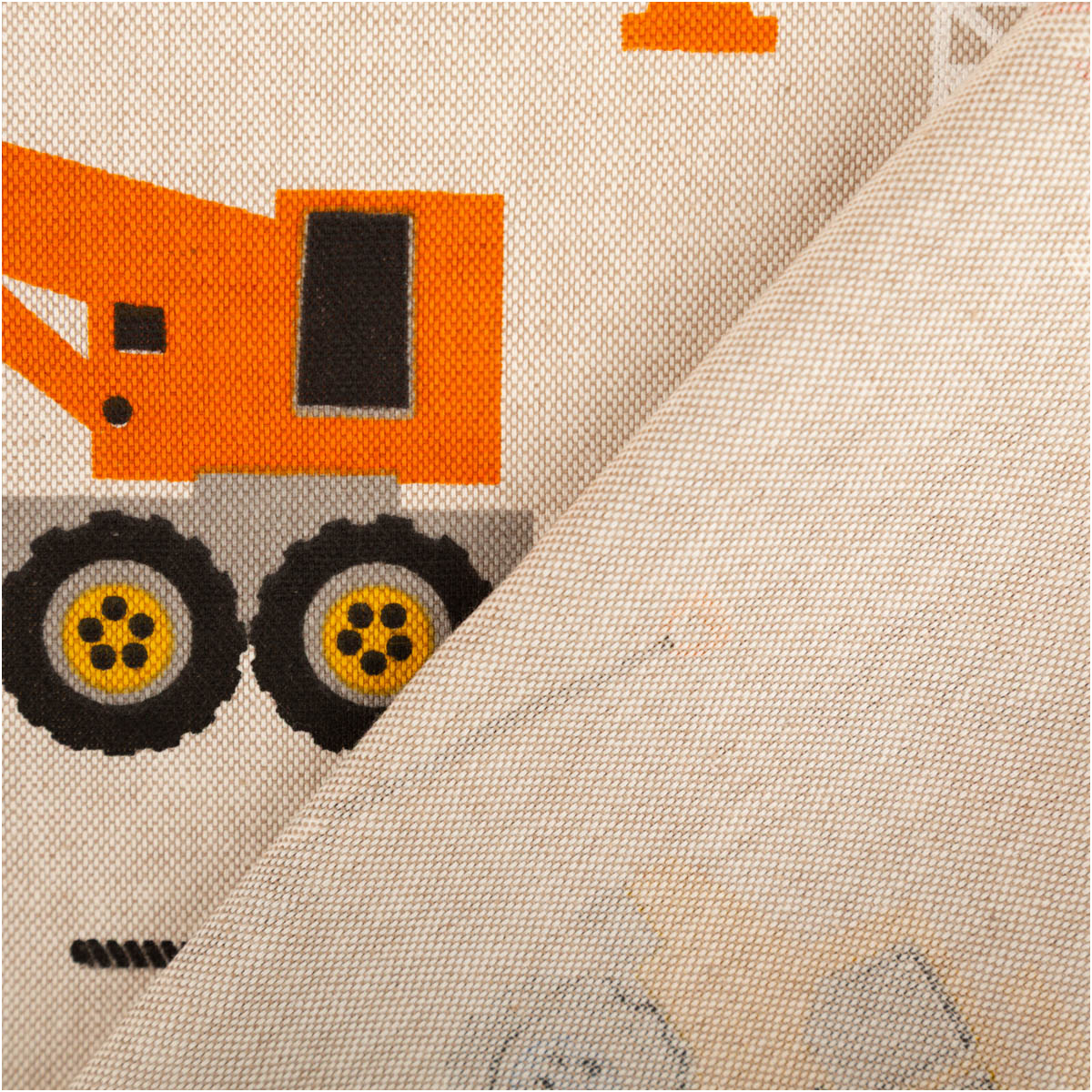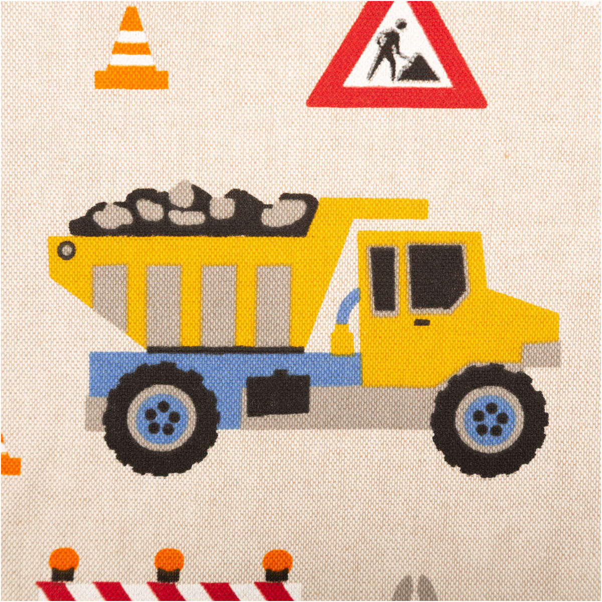 Dekostoff im Leinenlook mit bunten Baustellenmotiven für kreative Kinderzimmer