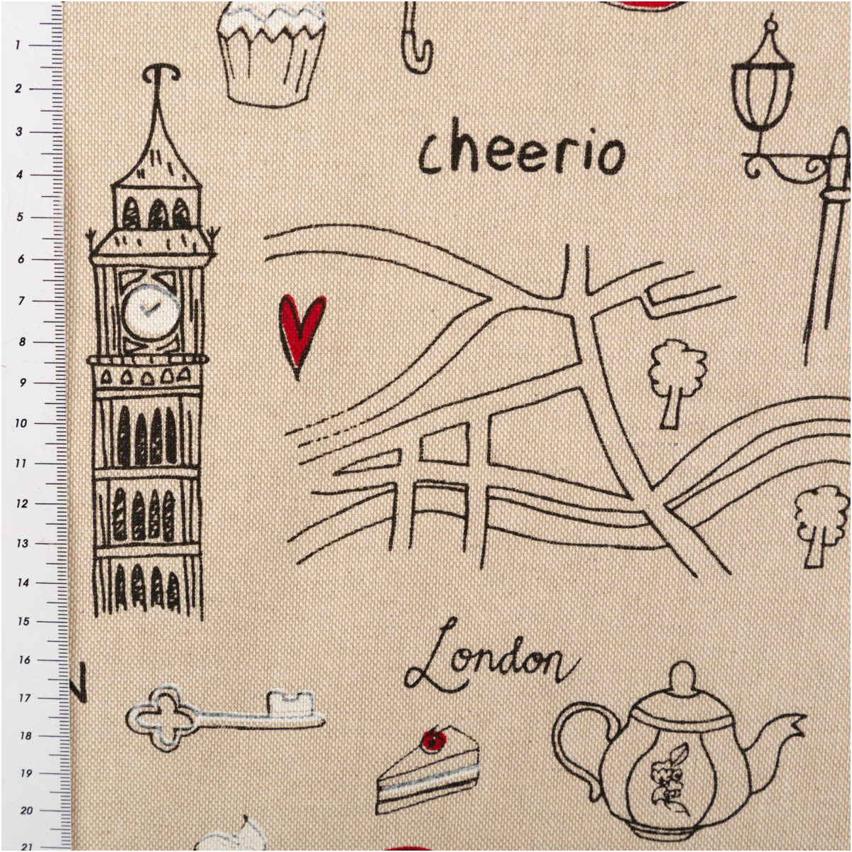 London-Motive im Leinenlook: Doppeldeckerbus, Telefonzelle, Teekanne, Union Jack und Wahrzeichen auf naturfarbenem Grund