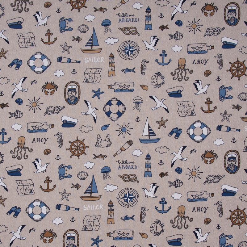 Mit diesem Dekostoff im Leinenlook bringst du maritime Leichtigkeit in dein Zuhause. Der naturfarbene Grund wirkt ruhig, freundlich und natürlich, während die detailreichen Motive in Blau, Weiß und warmen Naturtönen sofort an Küste, Hafen und Meer erinnern. Segelboote, Anker, Leuchttürme, Möwen, Rettungsringe, Steuerräder und weitere nautische Elemente machen den Stoff zu einem besonderen Hingucker für viele Deko- und Nähprojekte.