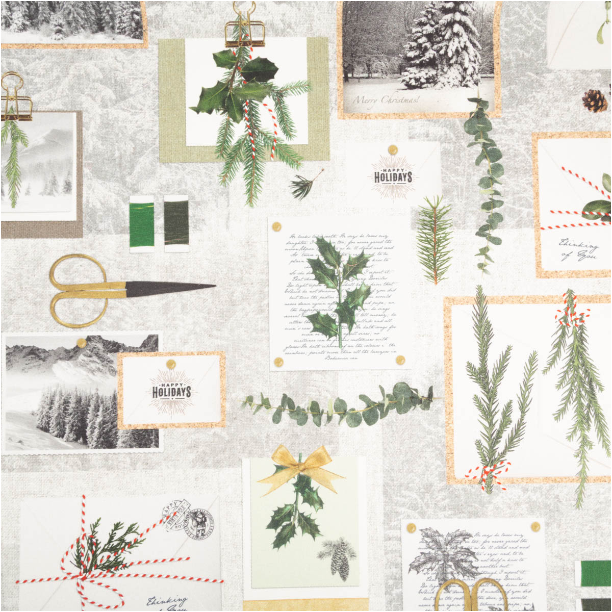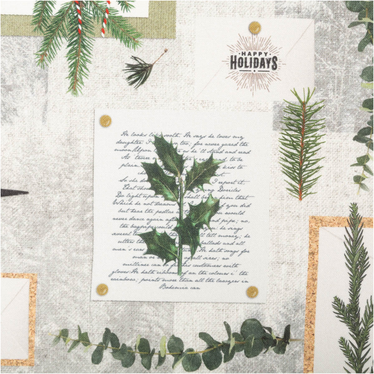 Dieser hochwertige Baumwollstoff Misty Stories bringt festliche Stimmung in dein Zuhause. Mit seinem grau marmorierten Hintergrund, den grünen Tannenzweigen und einem natürlichen, weihnachtlichen Vintage-Design ist er die perfekte Wahl für deine Weihnachtsprojekte.