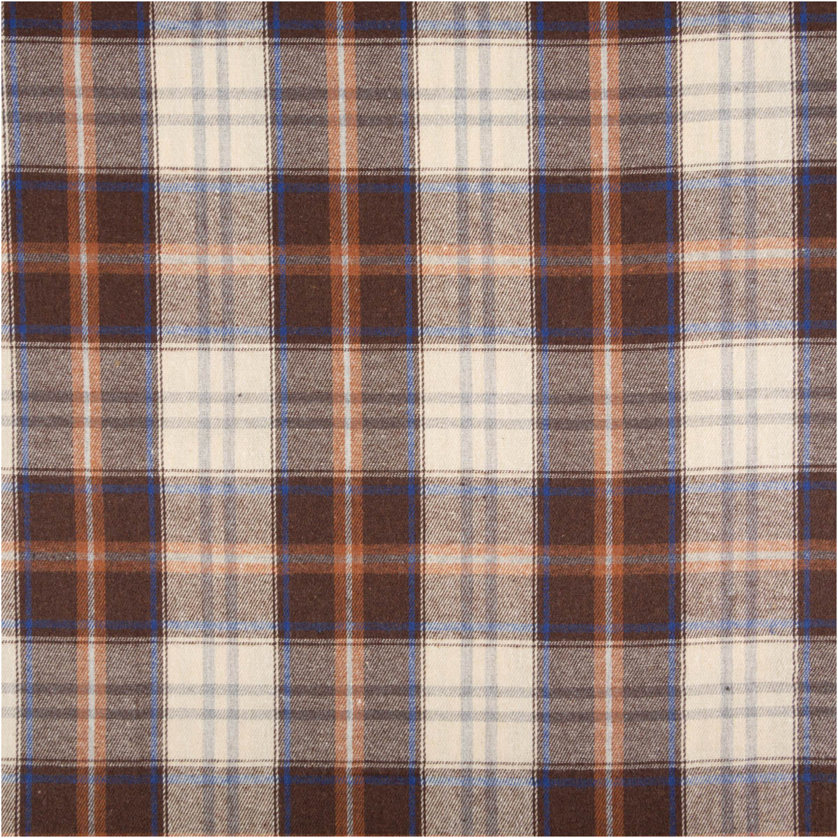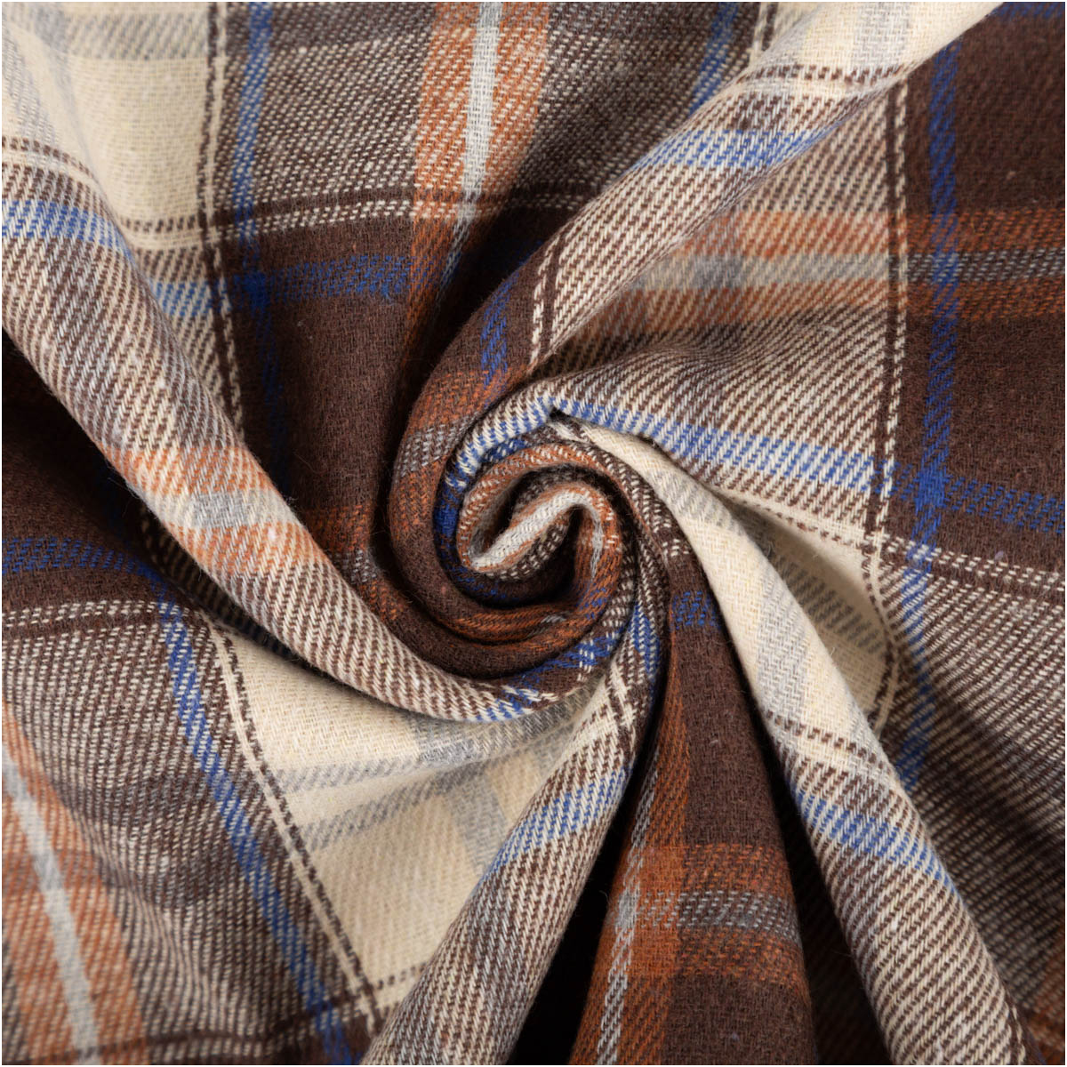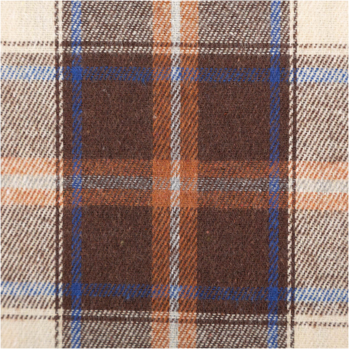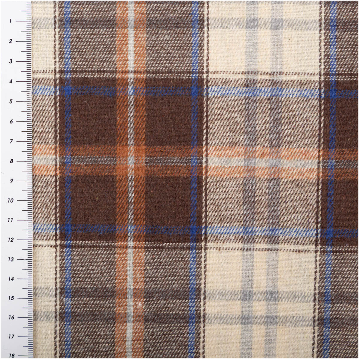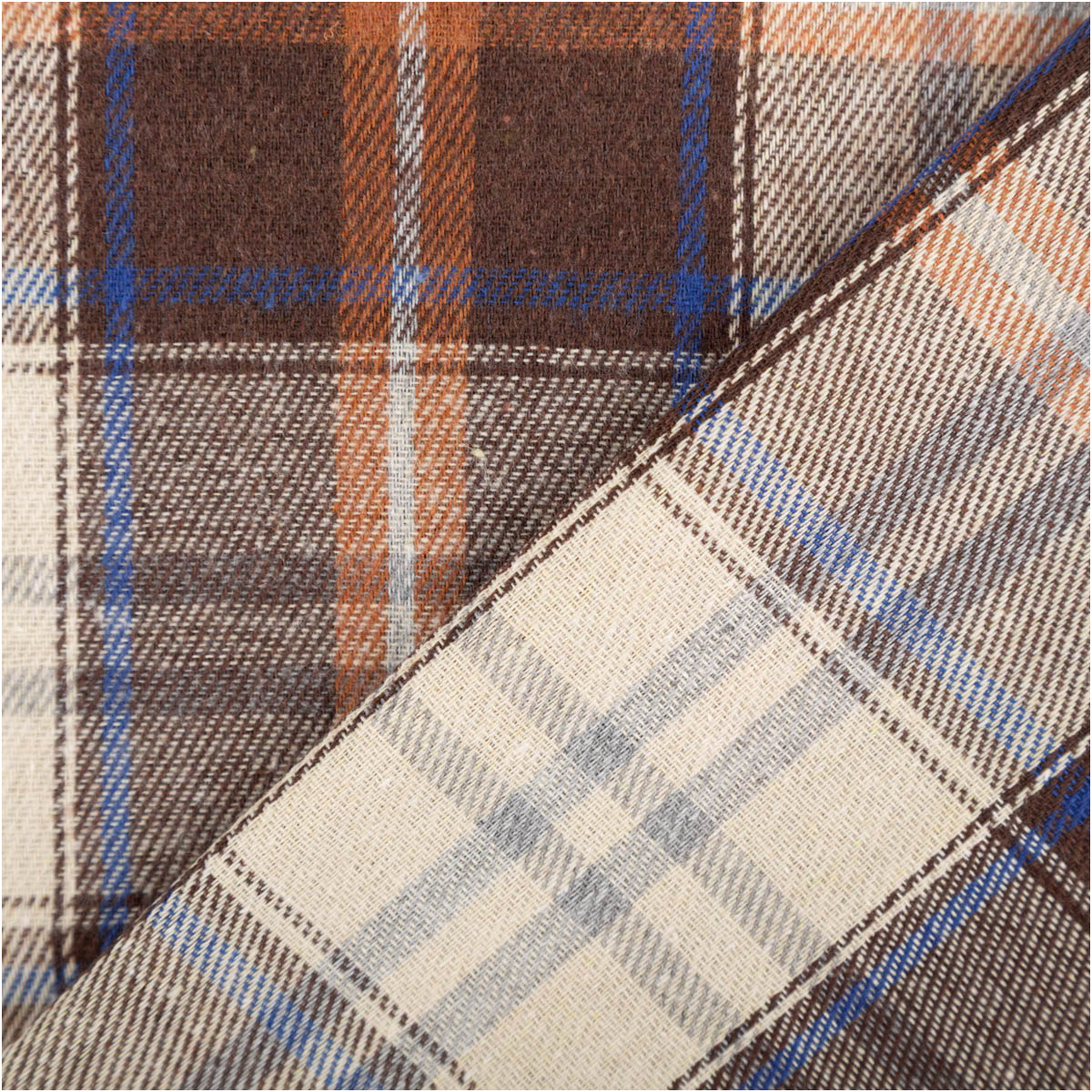 Der klassische Flanellstoff im Karo-Design in Braun, Creme und Blau überzeugt durch seine weiche, gebürstete Oberfläche und das garngefärbte Muster, das auf beiden Stoffseiten sichtbar ist. Mit einem Gewicht von 150 g/qm ist er leicht, hautfreundlich und angenehm zu tragen – ideal für Kleidung und Heimtextilien.