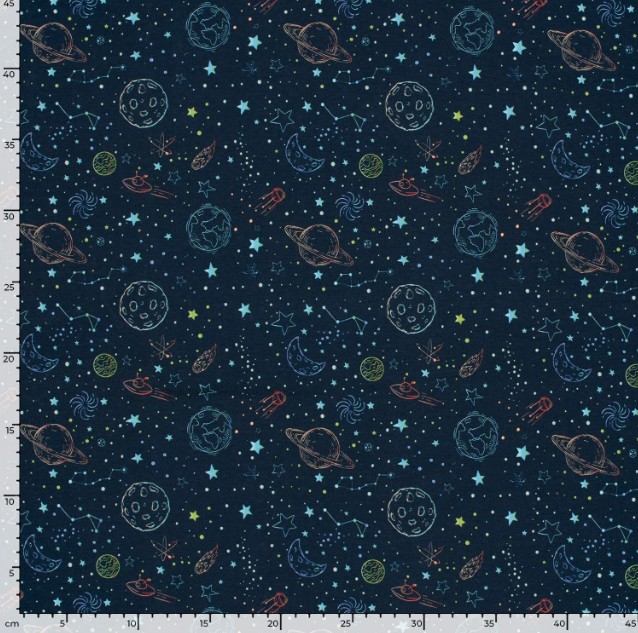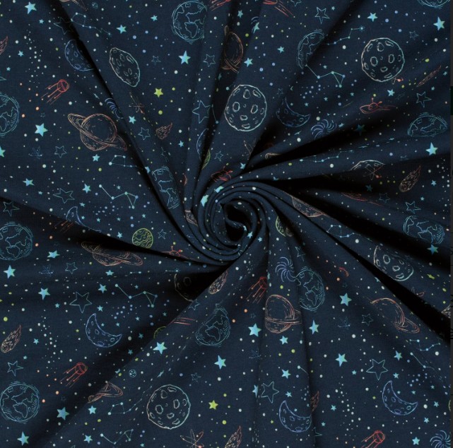 Ab ins All: Dieser French Terry in Marineblau zeigt Planeten, Sterne und Ufos. Weich, elastisch und pflegeleicht – perfekt für bequeme Hoodies, Shirts, Jogginghosen und Kinder-Outfits.