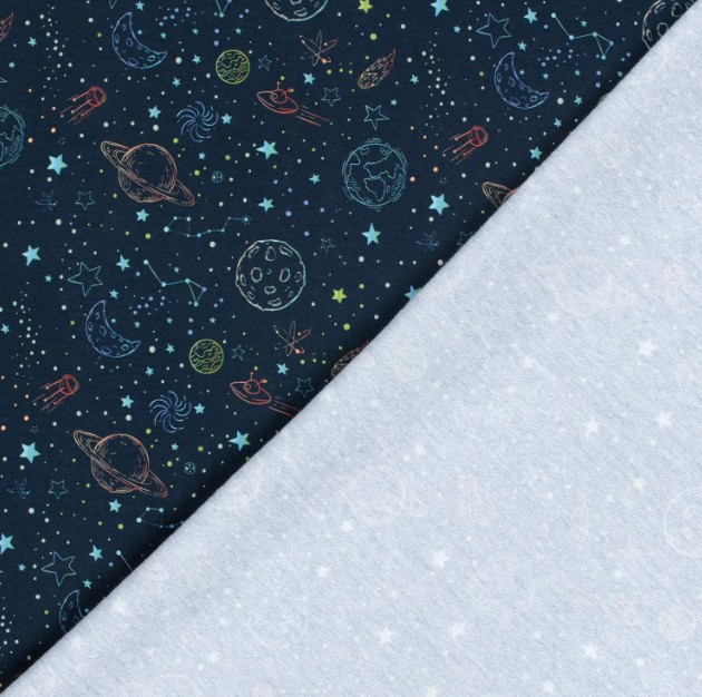 French Terry Stoff Weltrall mit Planeten und Ufos marineblau – 1,50 m Breite, elastisch & weich