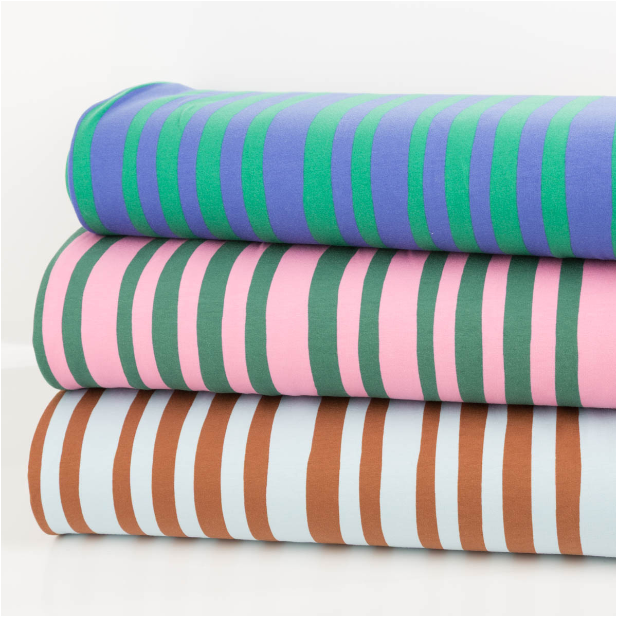 Das markante Streifenmuster in Blau und Braun wirkt modern, verspielt und ausdrucksstark. Es lässt sich schön mit schlichten Uni-Stoffen kombinieren und eignet sich sowohl für auffällige Einzelstücke als auch für bequeme Basics mit besonderem Look.