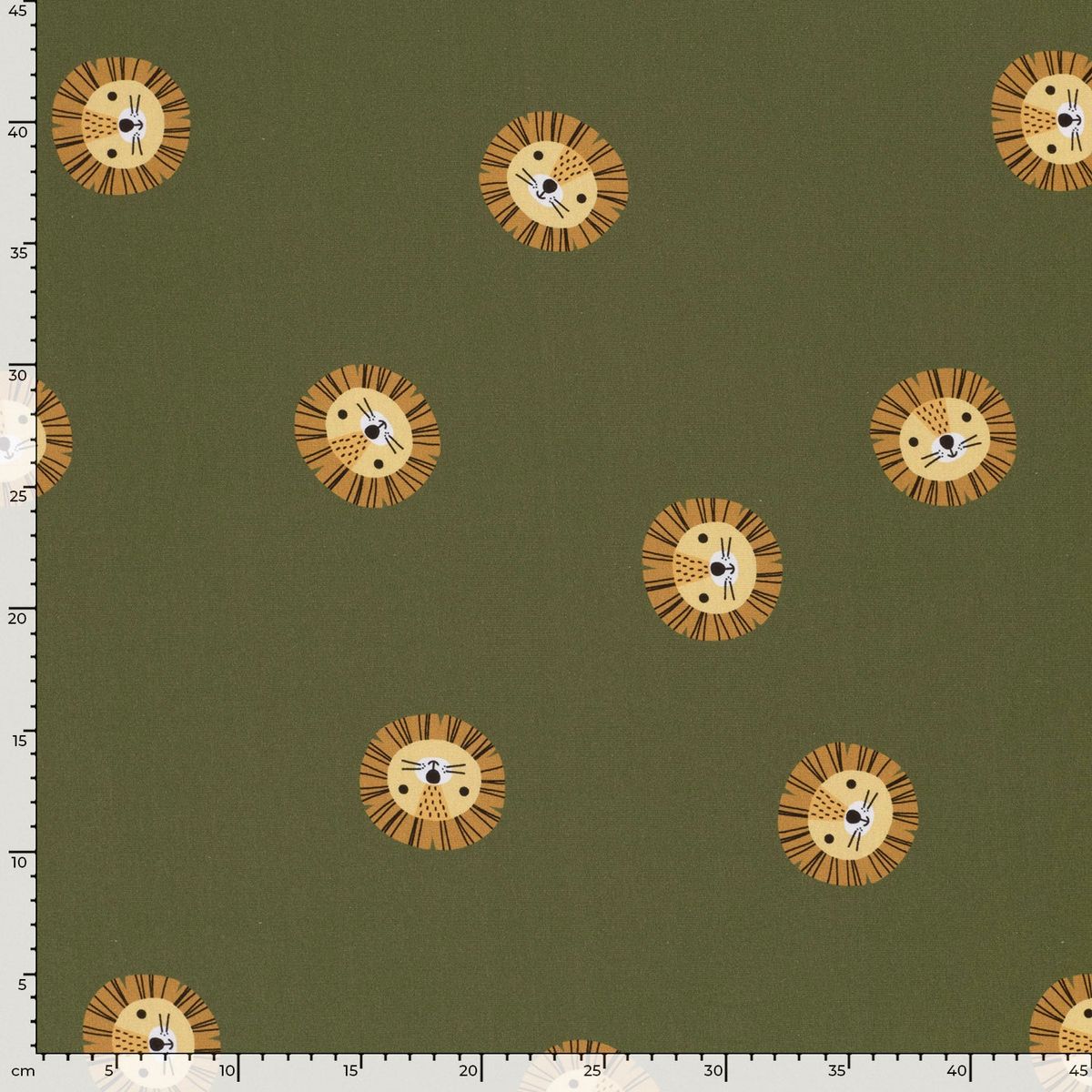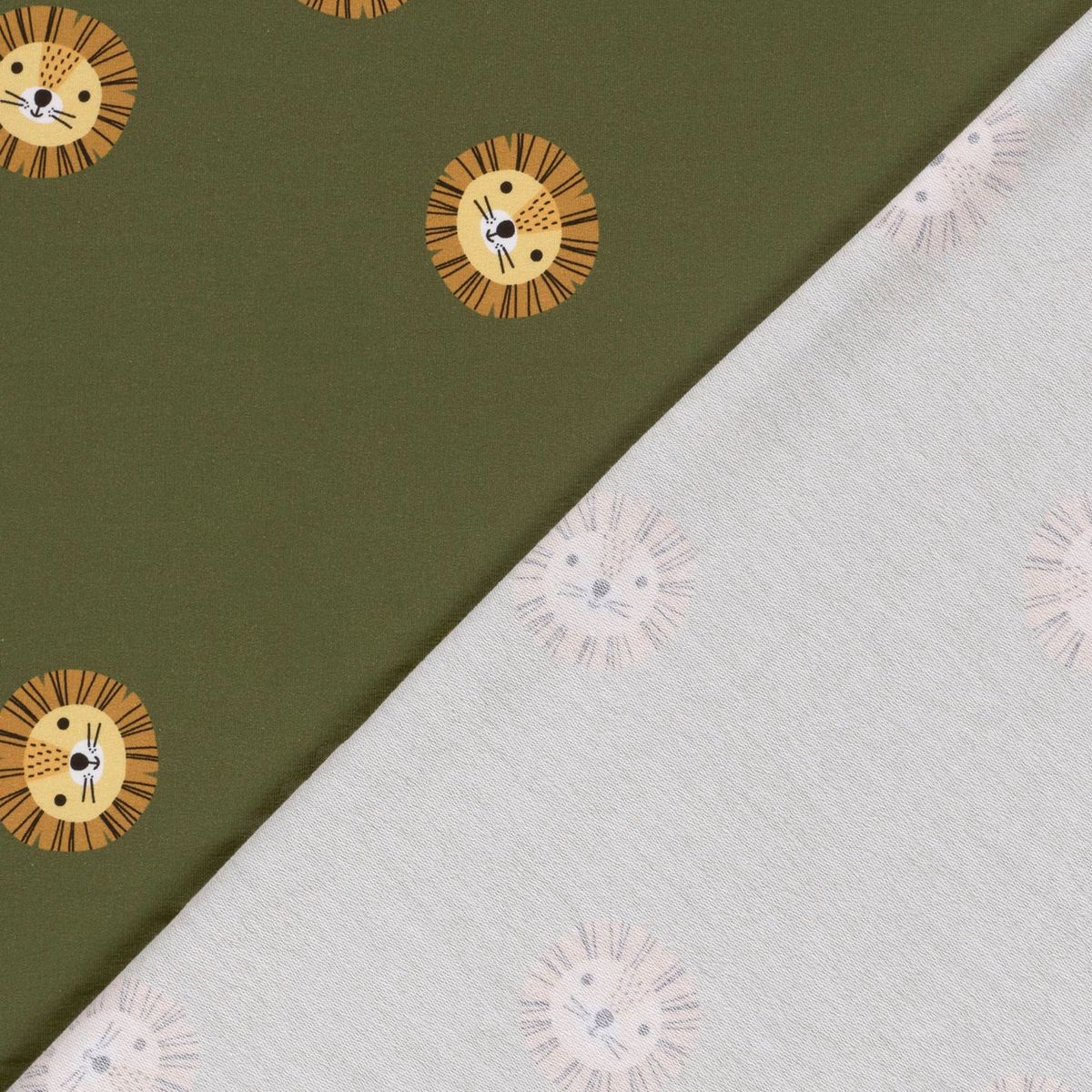 Entdecke den French Terry Stoff Löwe grün – ein vielseitiger Sommersweat mit Schlingenstruktur, der durch seinen hochwertigen Digitaldruck mit süßem Löwenmotiv begeistert. Der Stoff ist aus 92 % Baumwolle und 8 % Elasthan gefertigt, wodurch er angenehm weich, elastisch und atmungsaktiv ist.