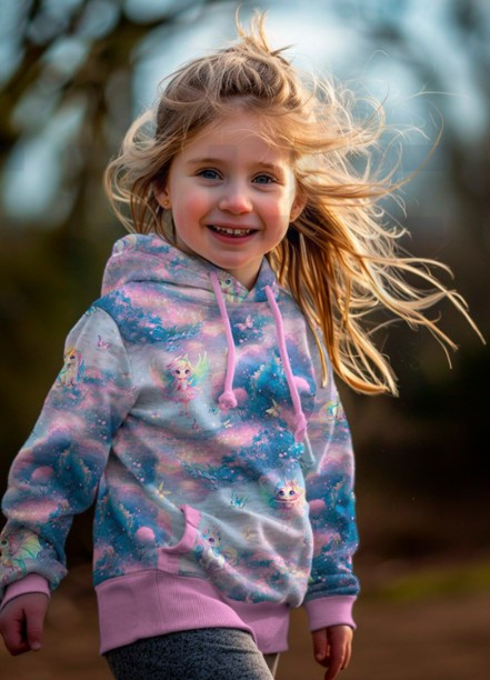 du suchst einen gemütlichen Stoff mit Zauberfaktor? Dieser French Terry aus der Poppy Kollektion zeigt verspielte Feen, Pferdchen und Schmetterlinge in Rosa und Blau. Er ist weich, elastisch und perfekt für Wohlfühl-Looks – von Hoodies bis Homewear.