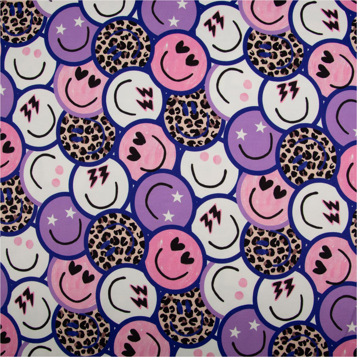 Dieser moderne French Terry Sommersweat aus der Poppy Kollektion begeistert mit einem auffälligen Digitaldruck aus Lachgesichtern, Leo-Elementen und grafischen Symbolen in lila, weiß und beige. Das fröhliche Design macht sofort gute Laune und ist perfekt für bequeme Alltagslooks für Kinder und Erwachsene.
