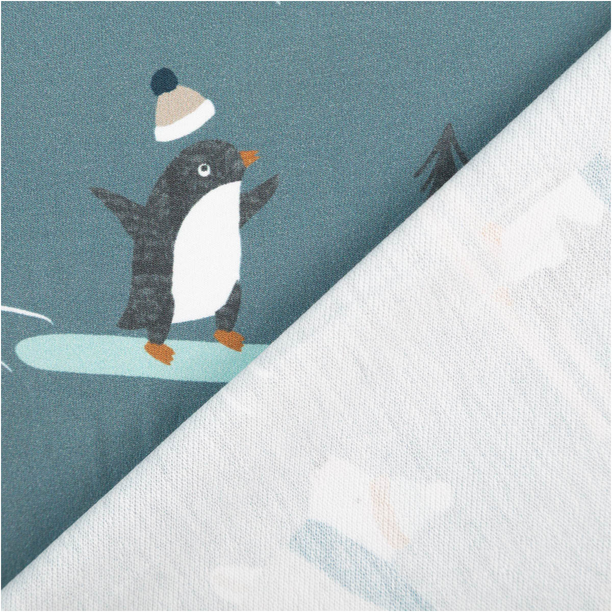 du magst nordisch-liebevolle Motive? Dieser French Terry zeigt Pinguin, Eisbär und Fuchs auf zartem Mintgrün. Der Stoff ist weich, formstabil und dank Elasthan angenehm elastisch – perfekt für gemütliche Looks.