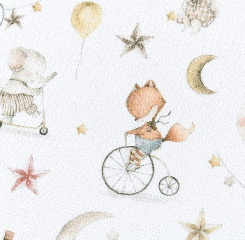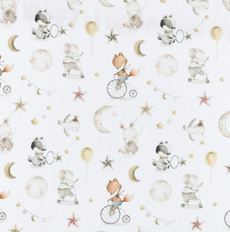 Der Frottee Stoff Sleepy Tierbabys begeistert mit einem besonders liebevollen, exklusiven Dessin: niedliche Tierbabys, Monde und Sterne in sanften Naturtönen auf weißem Grund. Die Vorderseite ist glatt bedruckt, die Rückseite besteht aus klassischem Frottee – dadurch ist der Stoff kuschelweich, saugstark und angenehm auf der Haut.