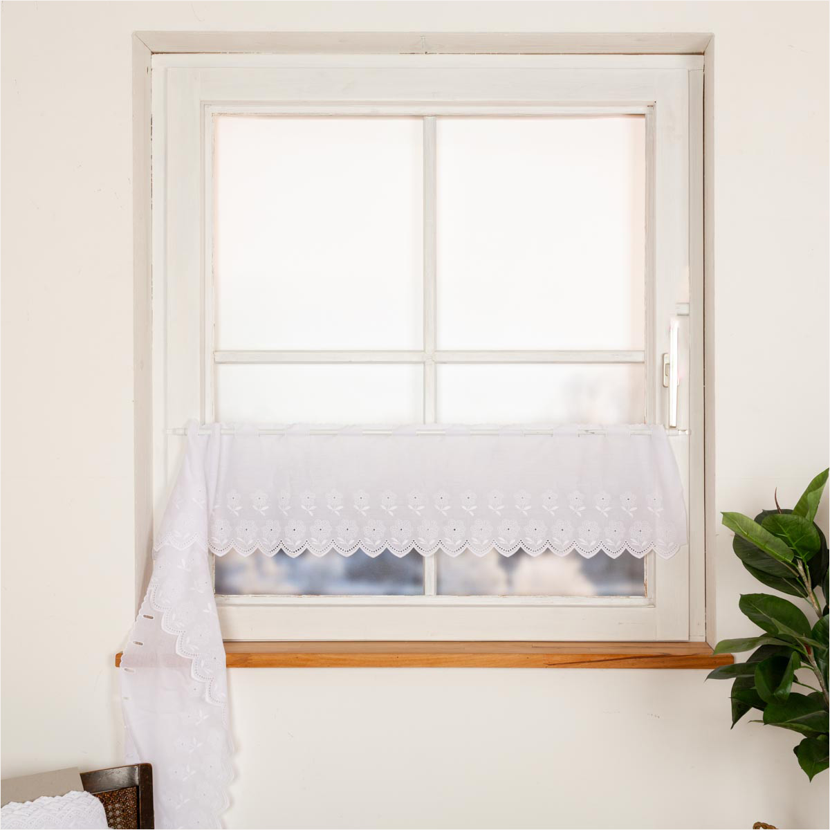 Du möchtest dein Fenster liebevoll dekorieren und suchst etwas Besonderes in hochwertiger Qualität? Diese feine Scheibengardine aus zartem Batist bringt mit ihrer detailreichen Blumen-Stickerei und dem eleganten Wellenrand romantischen Charme in dein Zuhause.