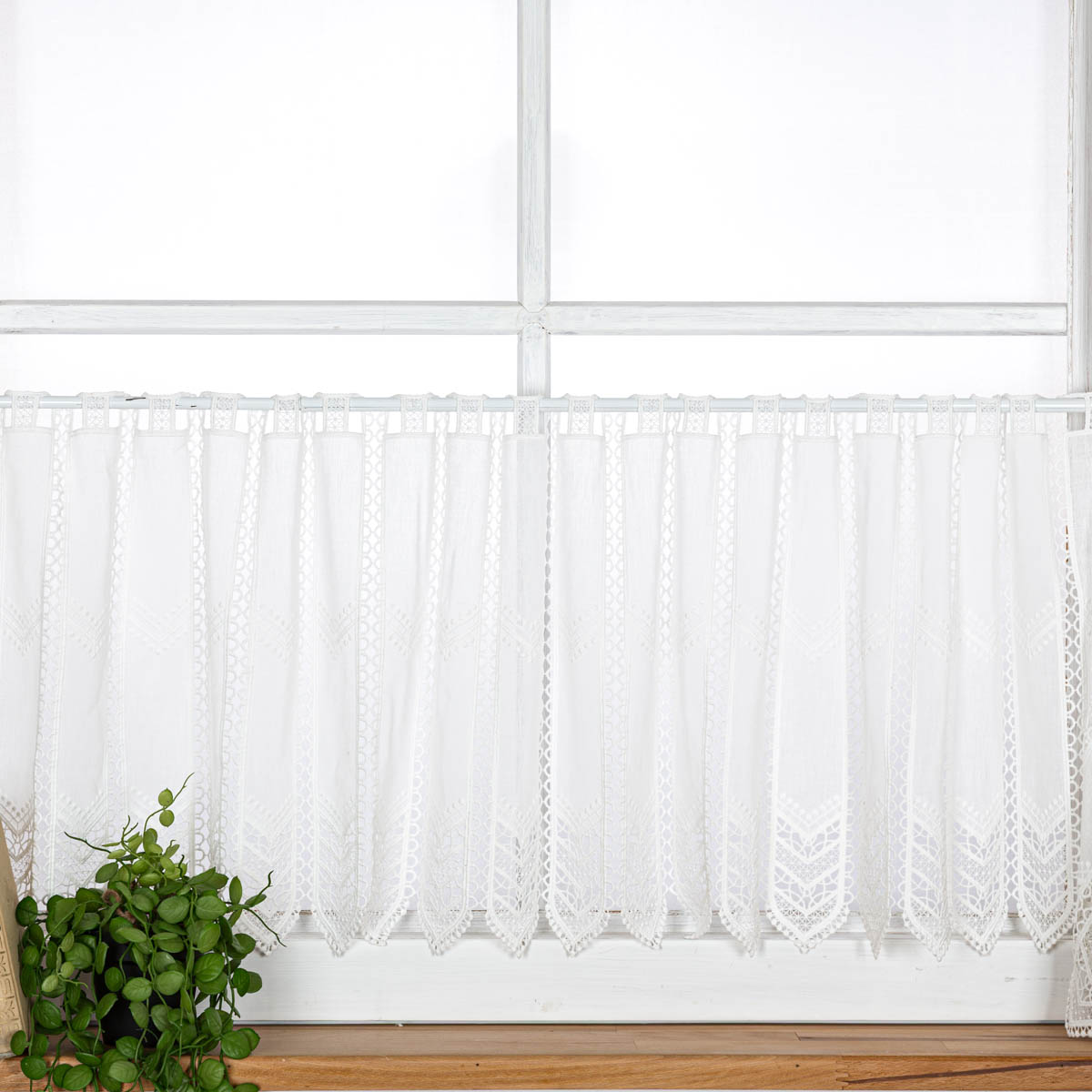 Scheibengardine in natürlicher Leinenoptik mit Makrameé-Stickerei in 45cm hoch – elegante Fensterdeko ohne Nähen