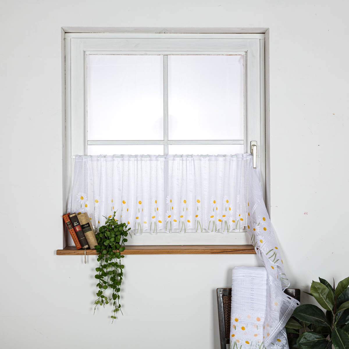 Die hübsche Scheibengardine mit Margeritenblumen ist ideal für alle Fenster, ob Küche, Wohnzimmer, Esszimmer oder Kinderzimmer und sorgt überall für einen blumig-frischen Look. Die Cafehausgardine gibt es zum Kombinieren in vier verschiedenen Größen: 45, 60, 90 und 100cm