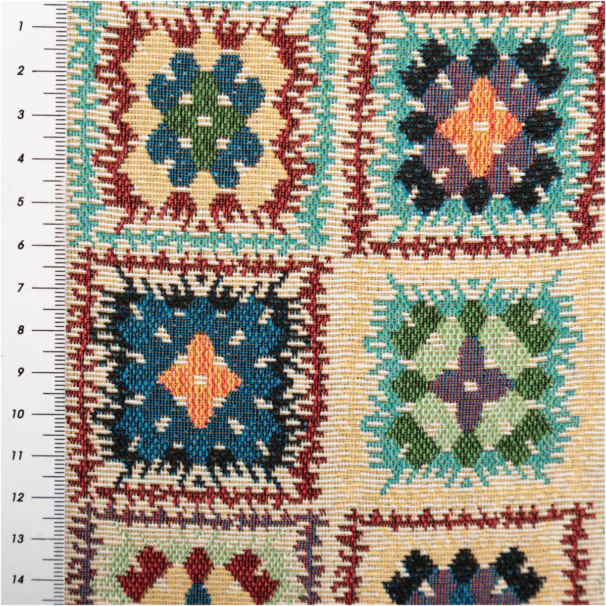 Robuster Gobelin Stoff in Jacquard Webart mit eingewebtem Häkelblumen Patchwork Design