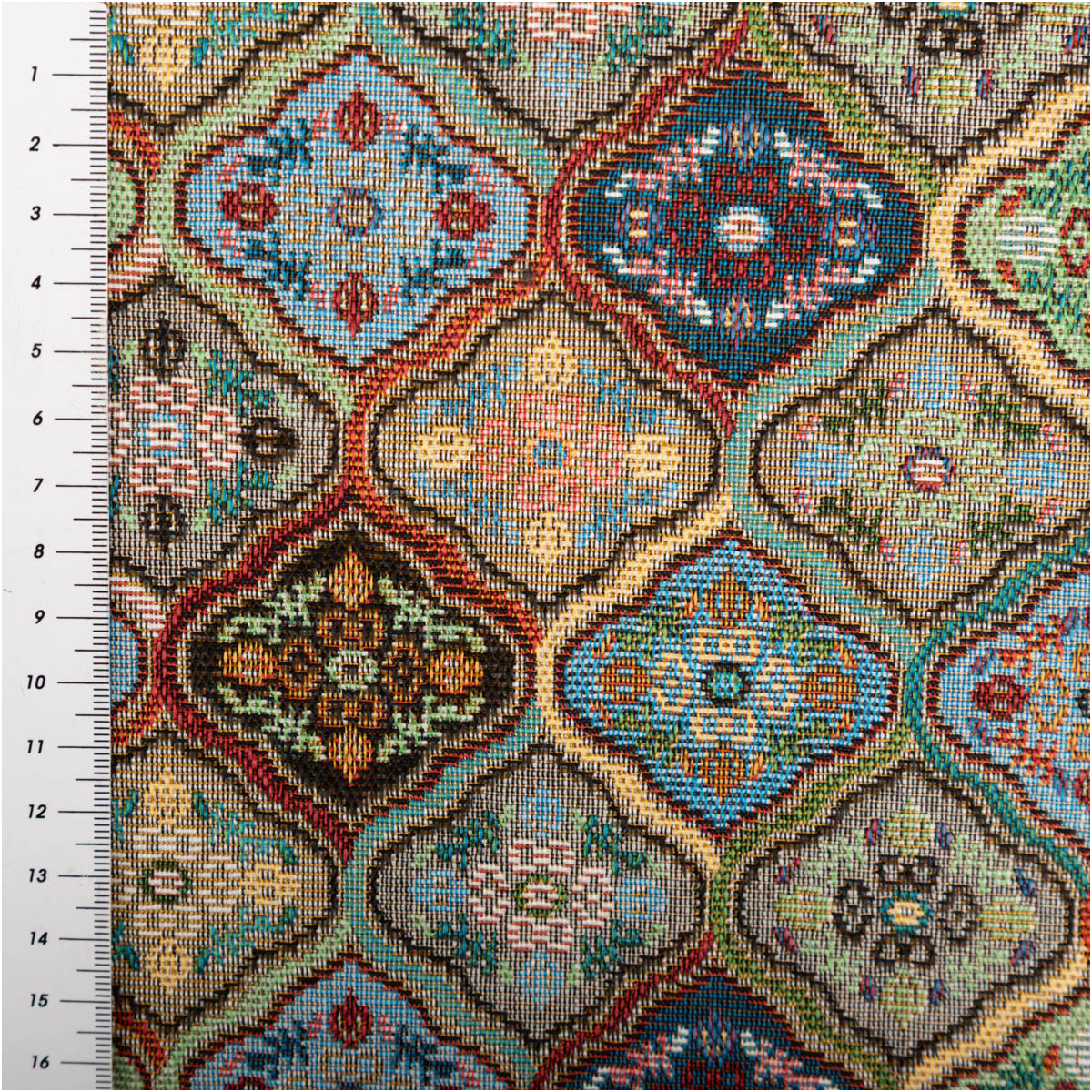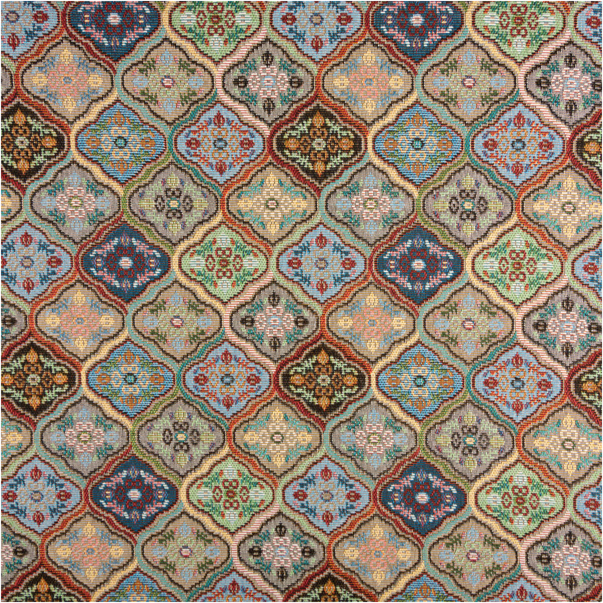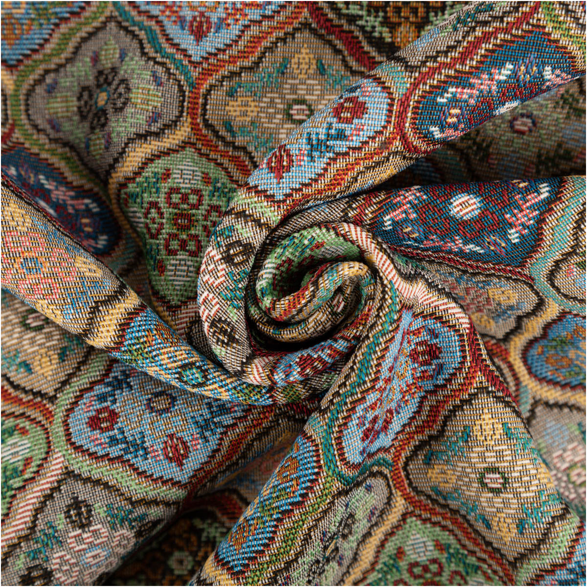 Dieser hochwertige Gobelin Stoff begeistert mit einem detailreichen Ornament- und Blümchenmuster in harmonisch abgestimmten Farben. Die Kombination aus Grün, Blau, Rot und Naturtönen verleiht dem Stoff eine klassische, leicht orientalisch angehauchte Optik und macht ihn zu einem echten Blickfang für deine Wohn- und Nähprojekte.