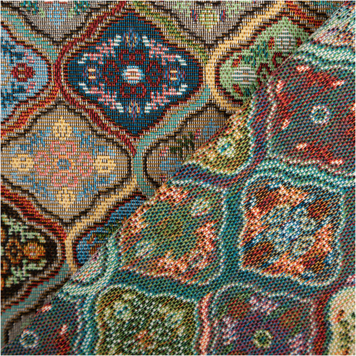 Das Design ist nicht aufgedruckt, sondern aufwendig eingewebt. Dadurch entsteht die typische Gobelin-Struktur mit einer festen, griffigen Oberfläche. Der Stoff wirkt besonders hochwertig und überzeugt durch seine Langlebigkeit sowie Formstabilität.