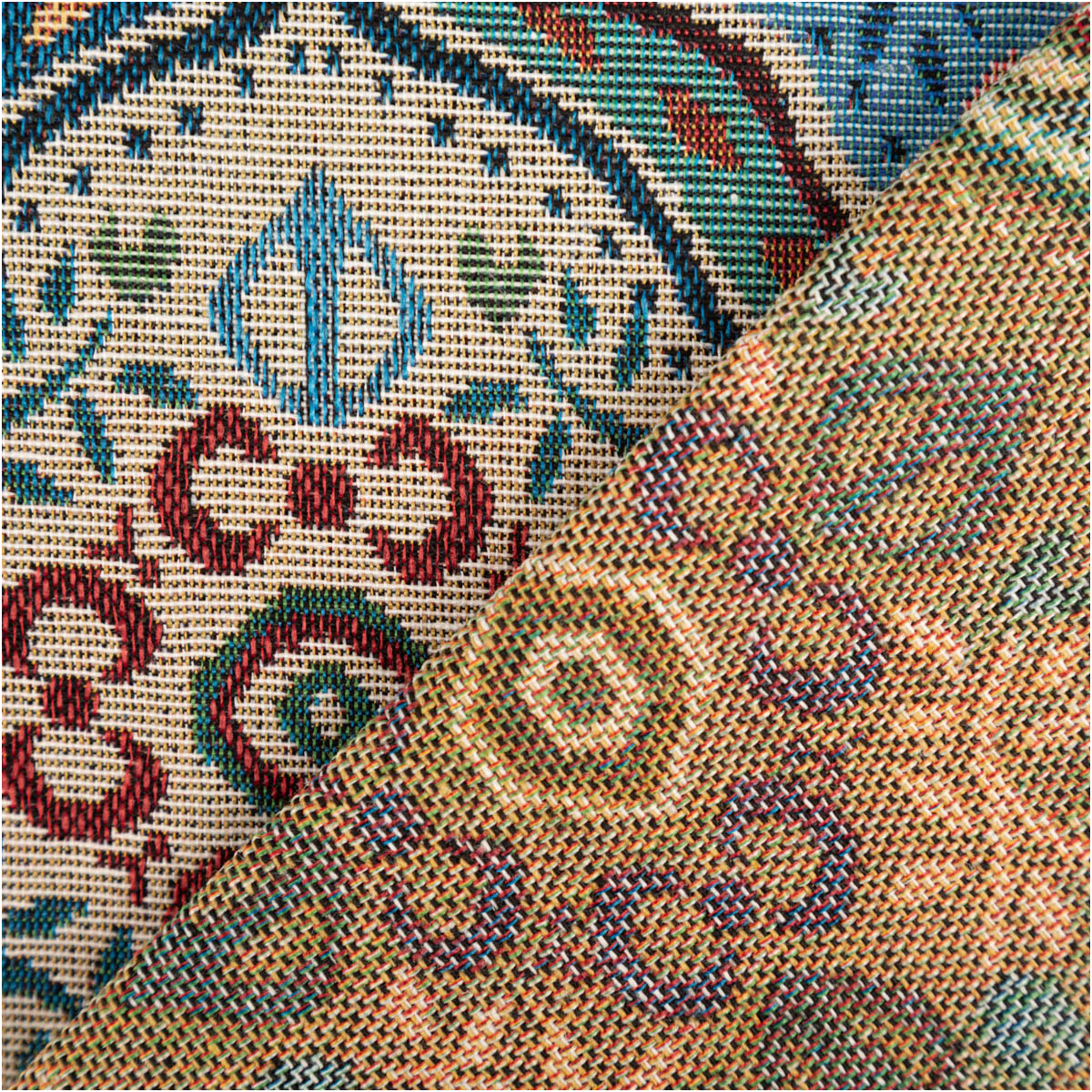 Die großflächigen Ornamente verbinden Blau, Creme, Rot, Grün und warme Naturtöne zu einem harmonischen Gesamtbild. Dadurch wirkt der Stoff lebendig, ohne unruhig zu werden. Das Muster passt wunderbar zu klassischen Einrichtungen, Boho-Ideen, orientalisch inspirierten Looks und individuellen Wohnkonzepten mit besonderem Stilgefühl.