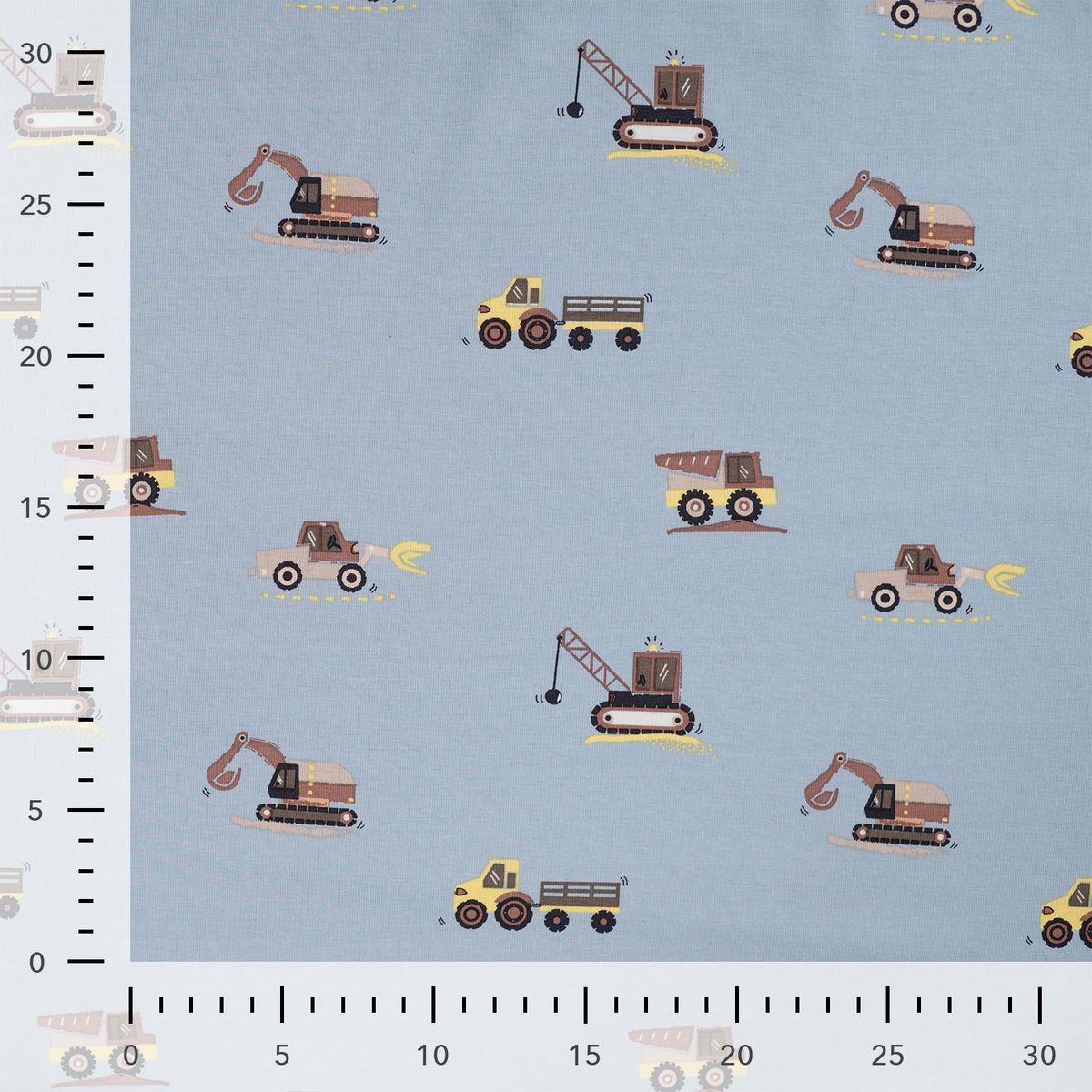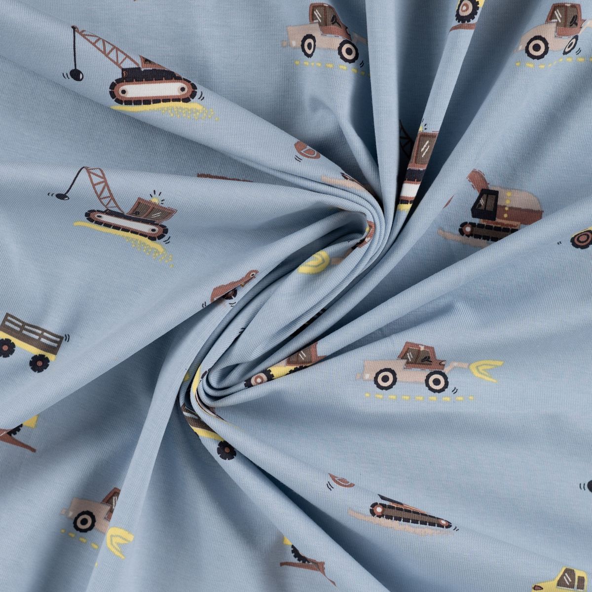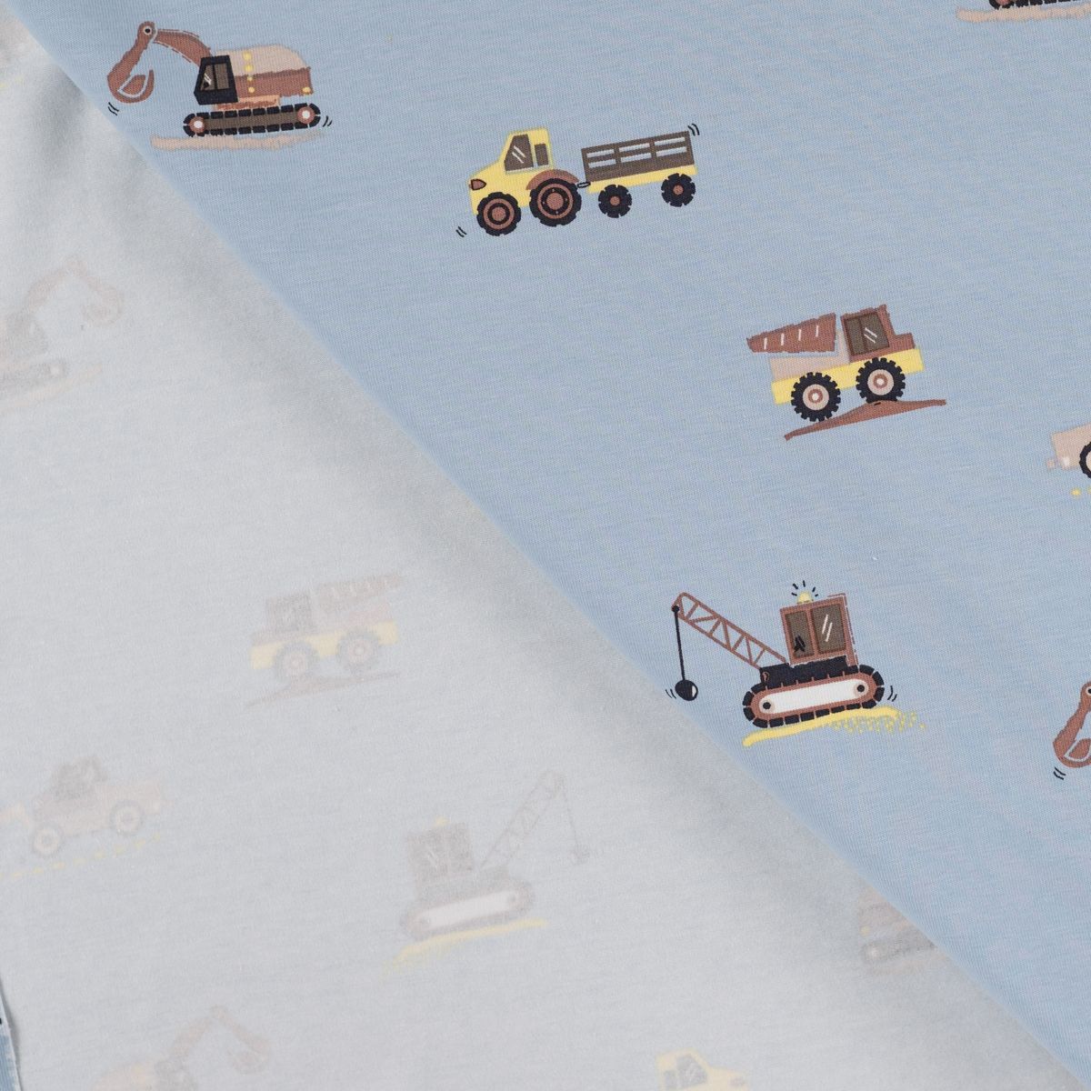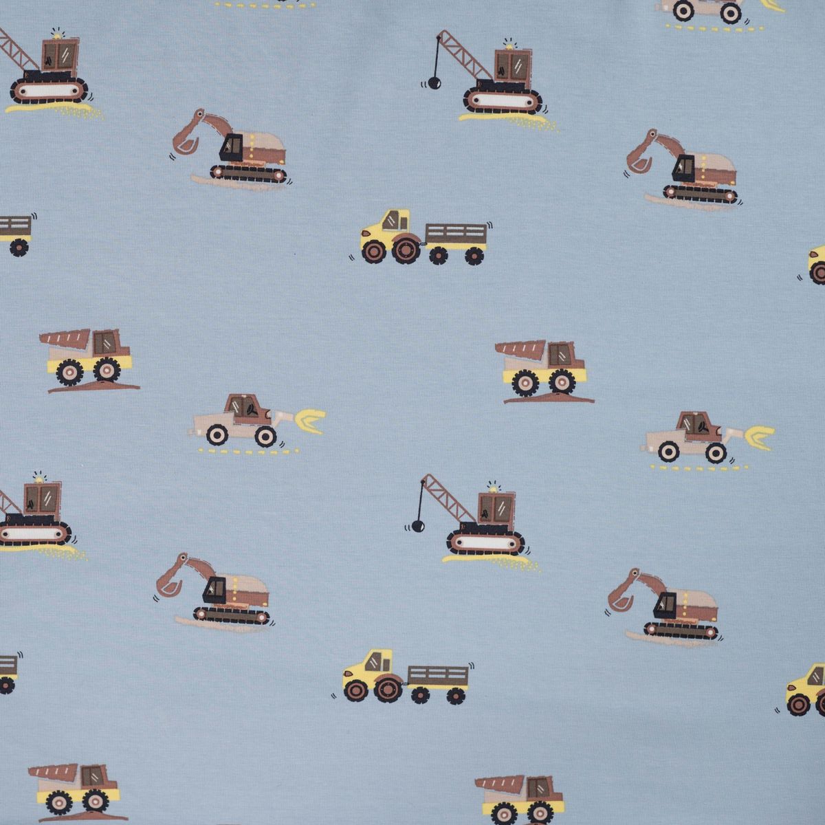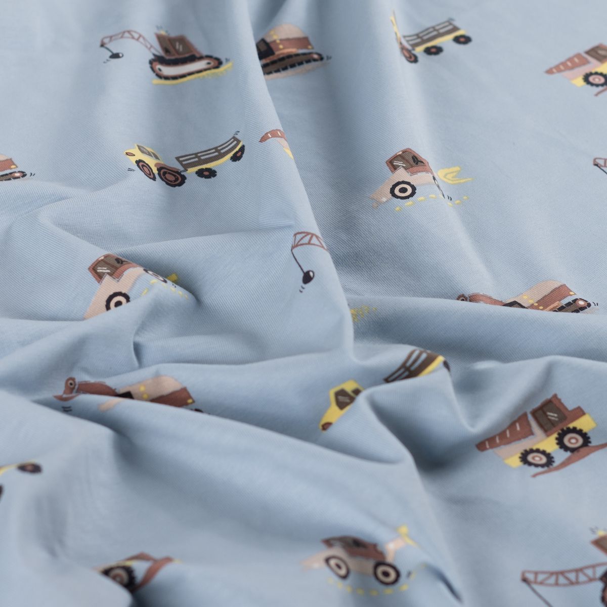 Baumwolljersey in Hellblau mit kleinen Baufahrzeugen wie Bagger, Kran und Laster für liebevolle Kinder-Nähprojekte